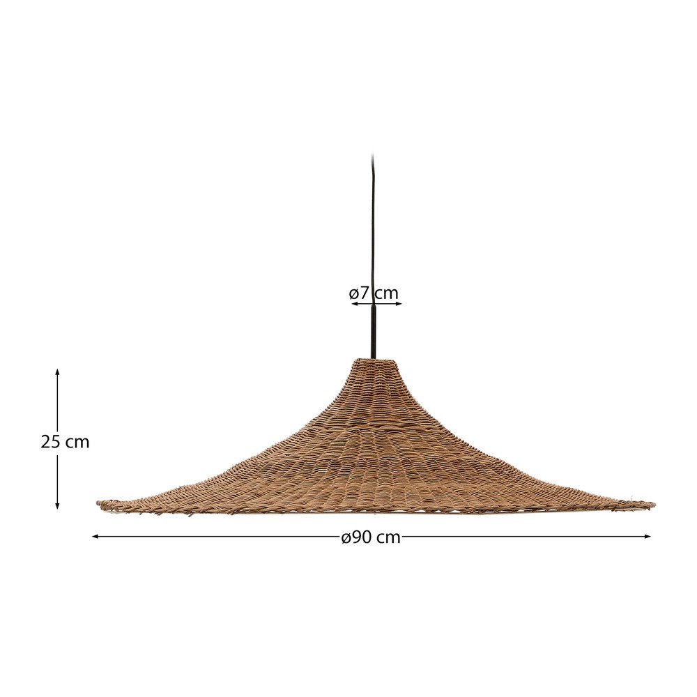 Został wykonany z rattanu, a jego unikalny kształt, przypominający szeroki kapelusz, jest efektem starannego ręcznego tkania.