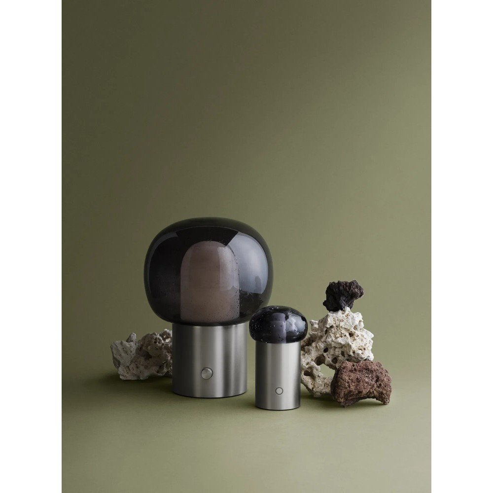 Lampa posiada duży szklany klosz z zamkniętymi bąbelkami powietrza, które przywołują na myśl podwodny świat. Aluminiowa podstawa kontrastuje z delikatnym szkłem. Pokrętło ze żłobieniami przełamuje czysty design.