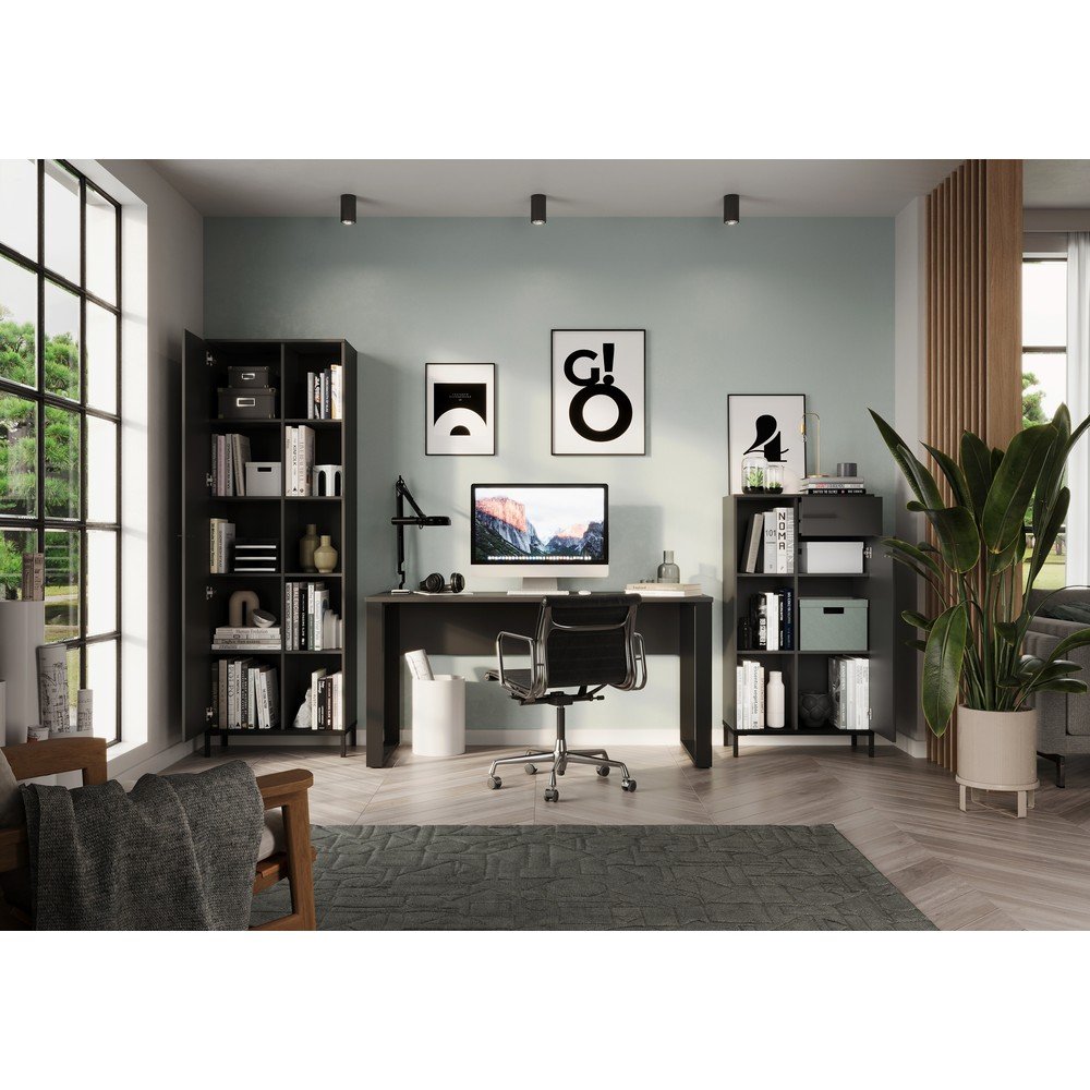 Antracytowy regał Rovigo marki Germania to elegancki i praktyczny dodatek do każdego wnętrza. Oferuje połączenie zamkniętego schowka z jedną szufladą i drzwiczkami, za którymi ukryte są dwie półki, oraz trzech otwartych półek. Dzięki wytrzymałej powierzchni i metalowym elementom w kolorze czarnym regał jest nie tylko stylowy, ale także odporny na zarysowania i uderzenia. Dzięki możliwości montażu z obu stron i nośności do 15 kg na półkę, idealnie nadaje się do porządkowania książek i dokumentów.