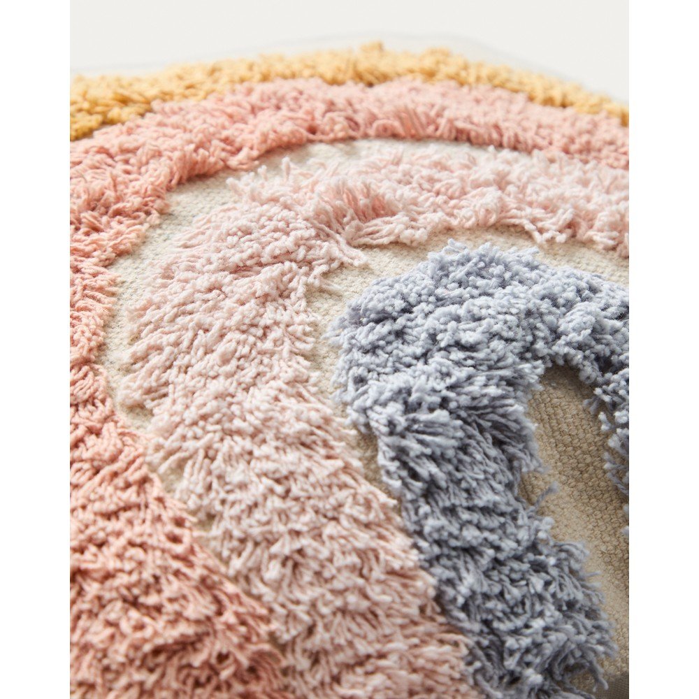 Każda poszewka jest ręcznie tkana, co gwarantuje jej unikalność i drobne różnice, które podkreślają jej ekskluzywny i osobisty charakter. Design poszewki zdobią wypukłe, tęczowe reliefy, które uzupełniają zabawne frędzle, tworząc uroczy detal dekoracyjny, który ozdobi dziecięcą przestrzeń.