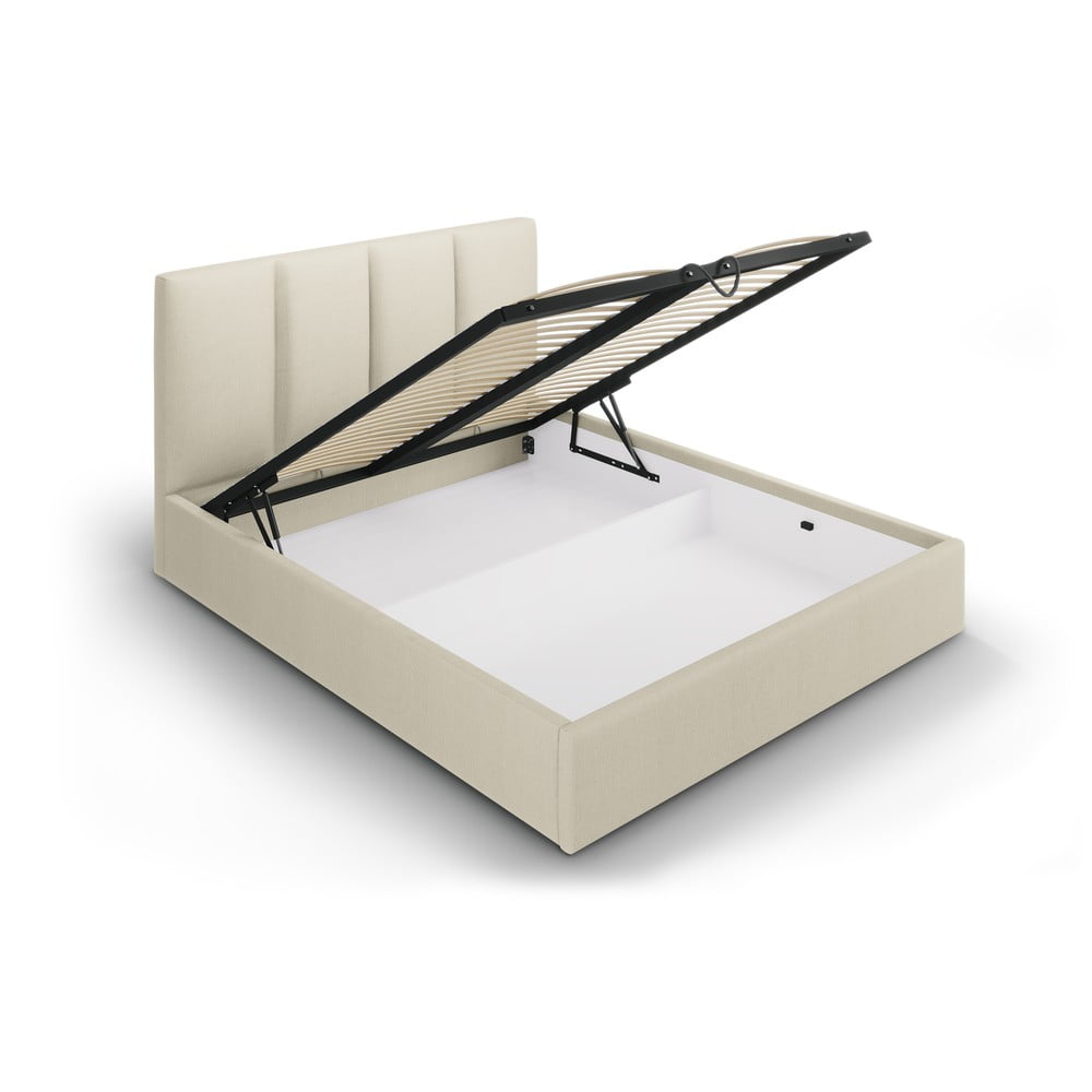 Beżowe tapicerowane łóżko dwuosobowe ze schowkiem ze stelażem 140×200 cm Juniper – Mazzini Beds