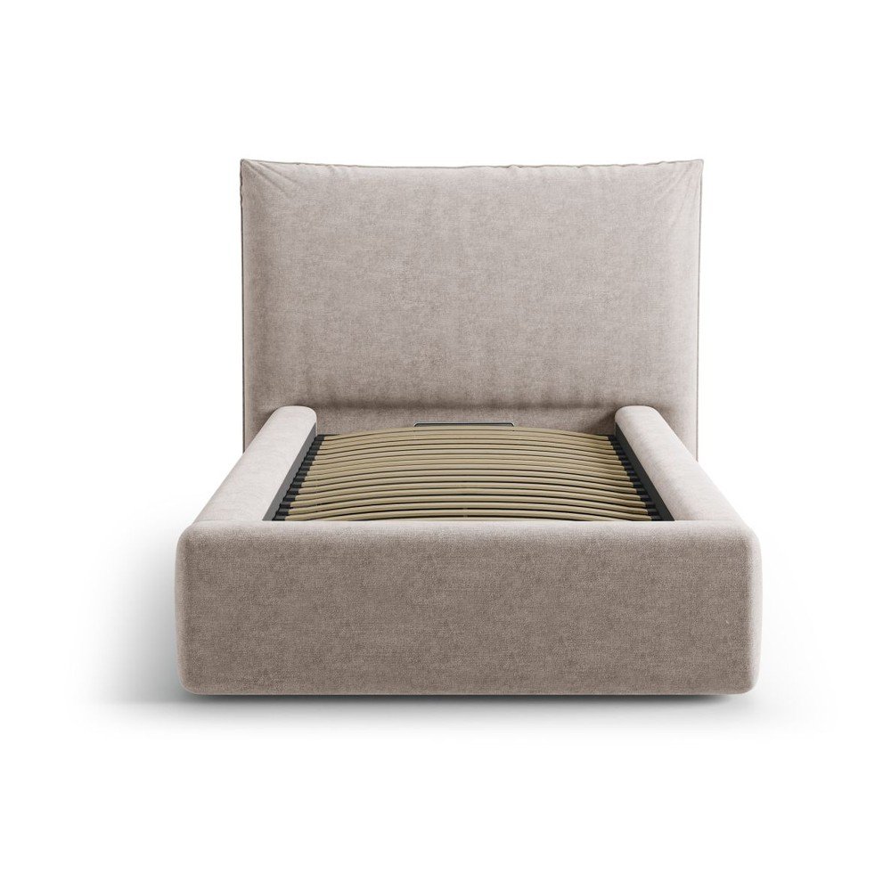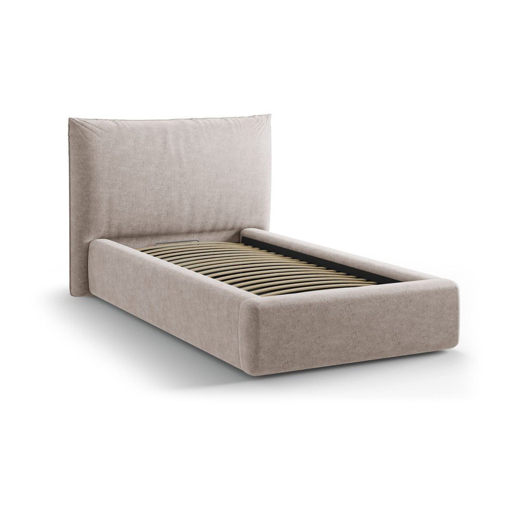 Beżowe tapicerowane łóżko jednoosobowe ze schowkiem i stelażem 90×200 cm Kaelle – Micadoni