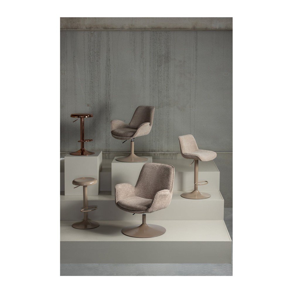 Zaprojektowany z myślą o komforcie użytkownika, fotel ma regulowaną wysokość siedziska w zakresie od 42 do 48 cm, dzięki czemu można go łatwo dostosować do własnych potrzeb. Stoi na stabilnej okrągłej podstawie, która nadaje całemu projektowi elegancki wygląd.