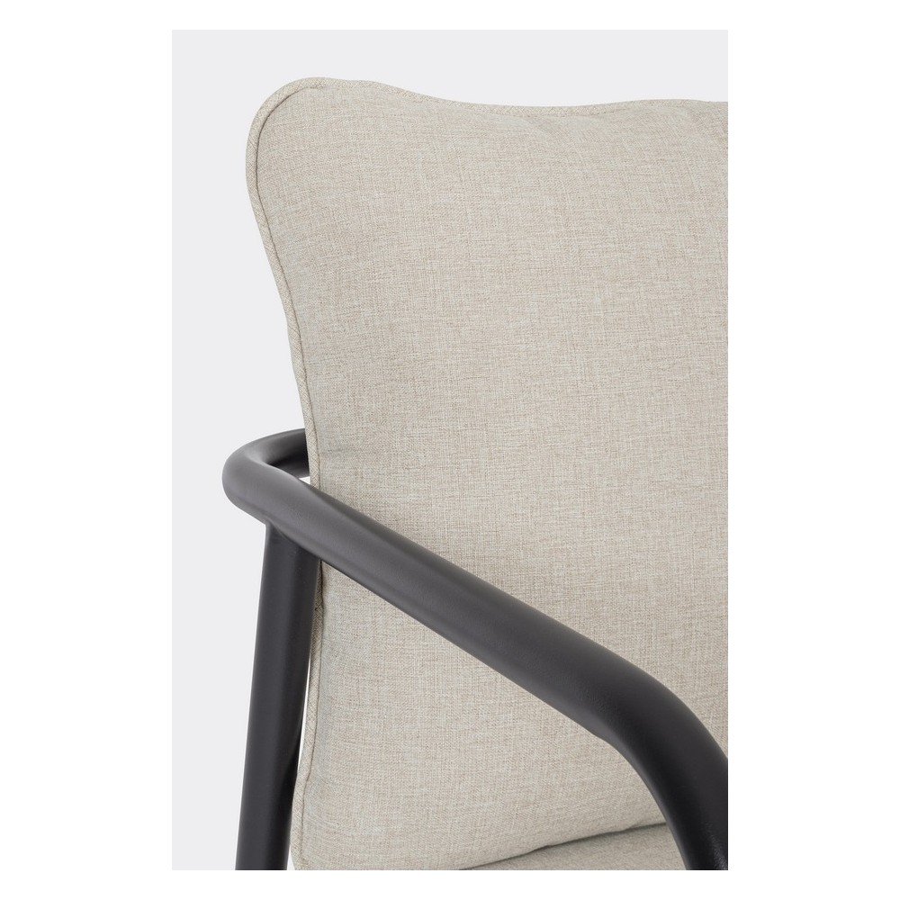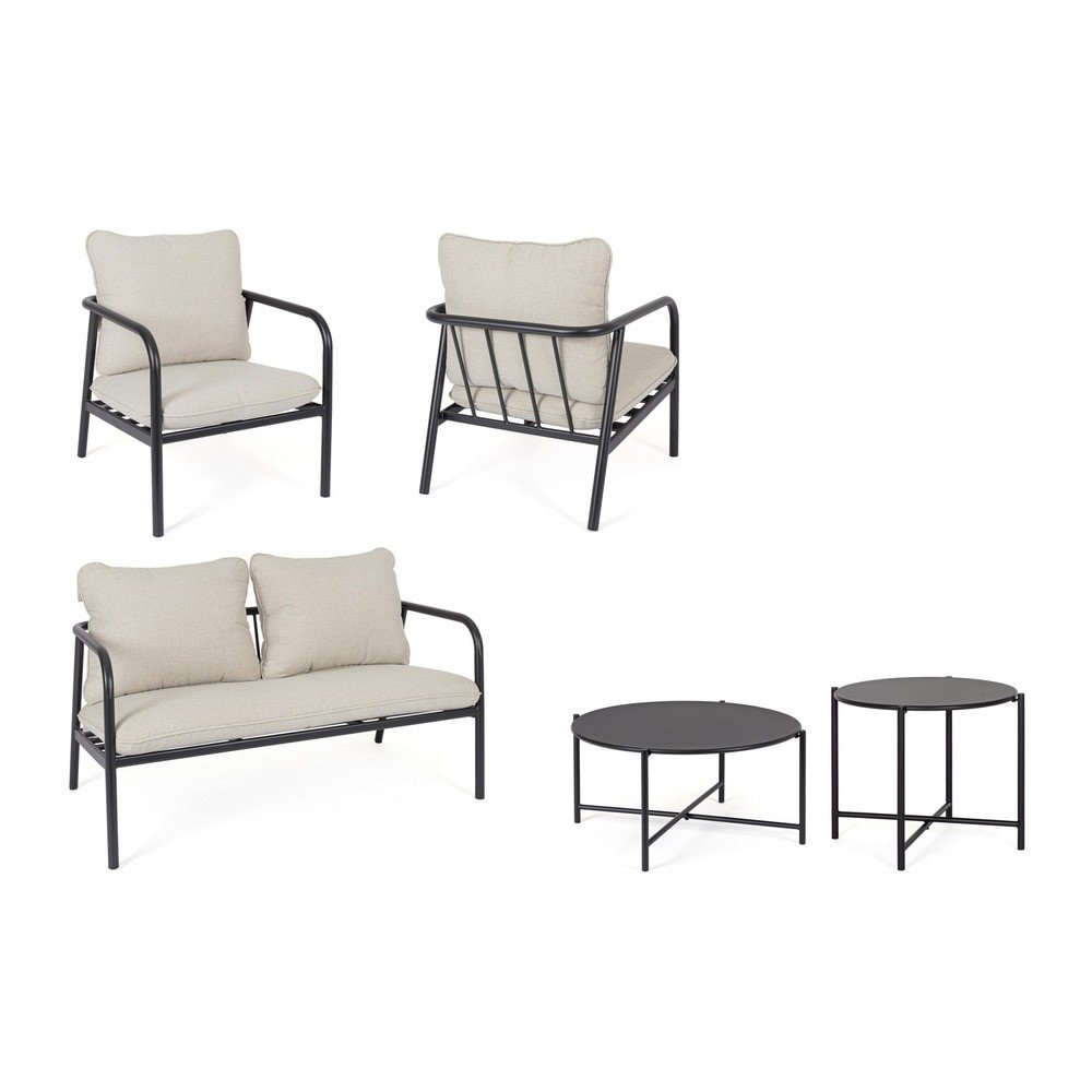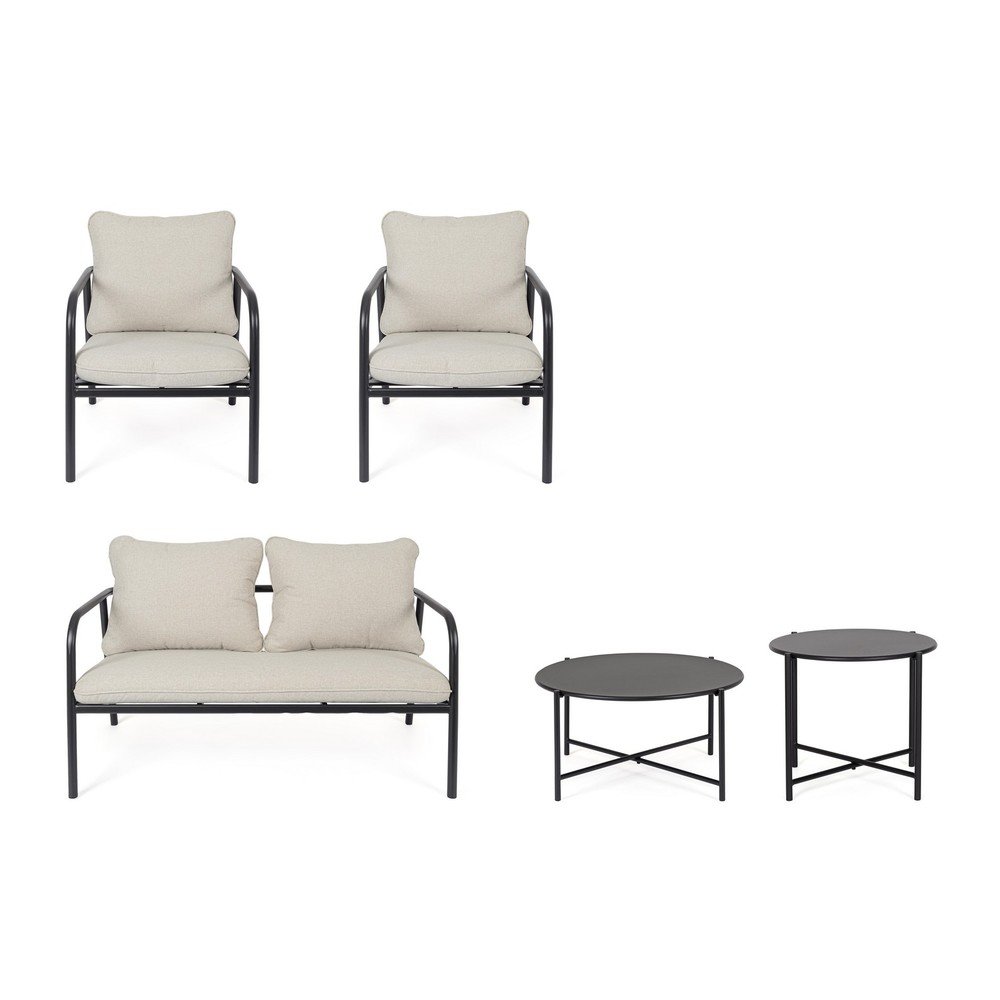 W skład zestawu wchodzą również dwa okrągłe stoliki z krzyżową podstawą. Większy stolik ma średnicę 73 cm i wysokość 35 cm, a mniejszy średnicę 53 cm i wysokość 43 cm. Konstrukcja całego zestawu składa się z solidnej metalowej ramy, która zapewnia stabilność i trwałość.