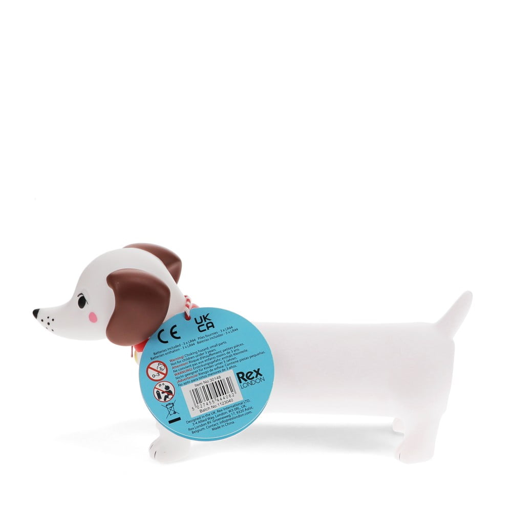 Lampka nocna LED Sausage Dog marki Rex London to uroczy towarzysz do pokoju dziecięcego. Jej kształt przypomina jamnika i jest idealna do zapewnienia delikatnego światła, który pomoże dzieciom zasnąć.