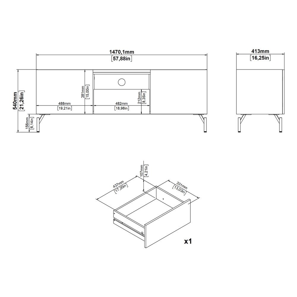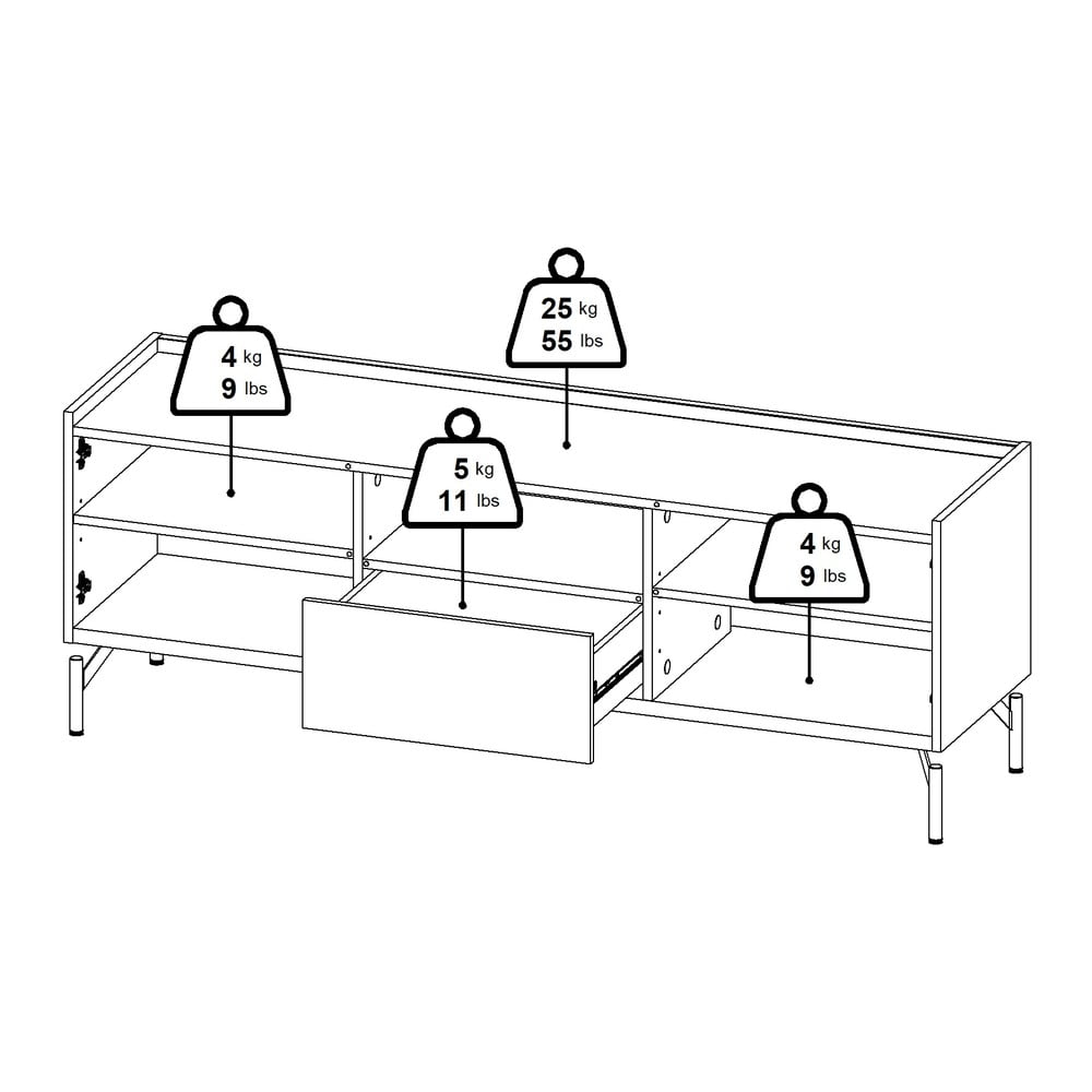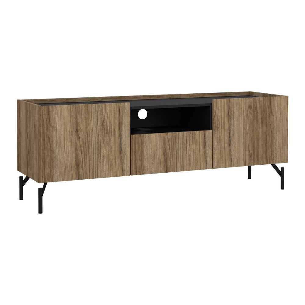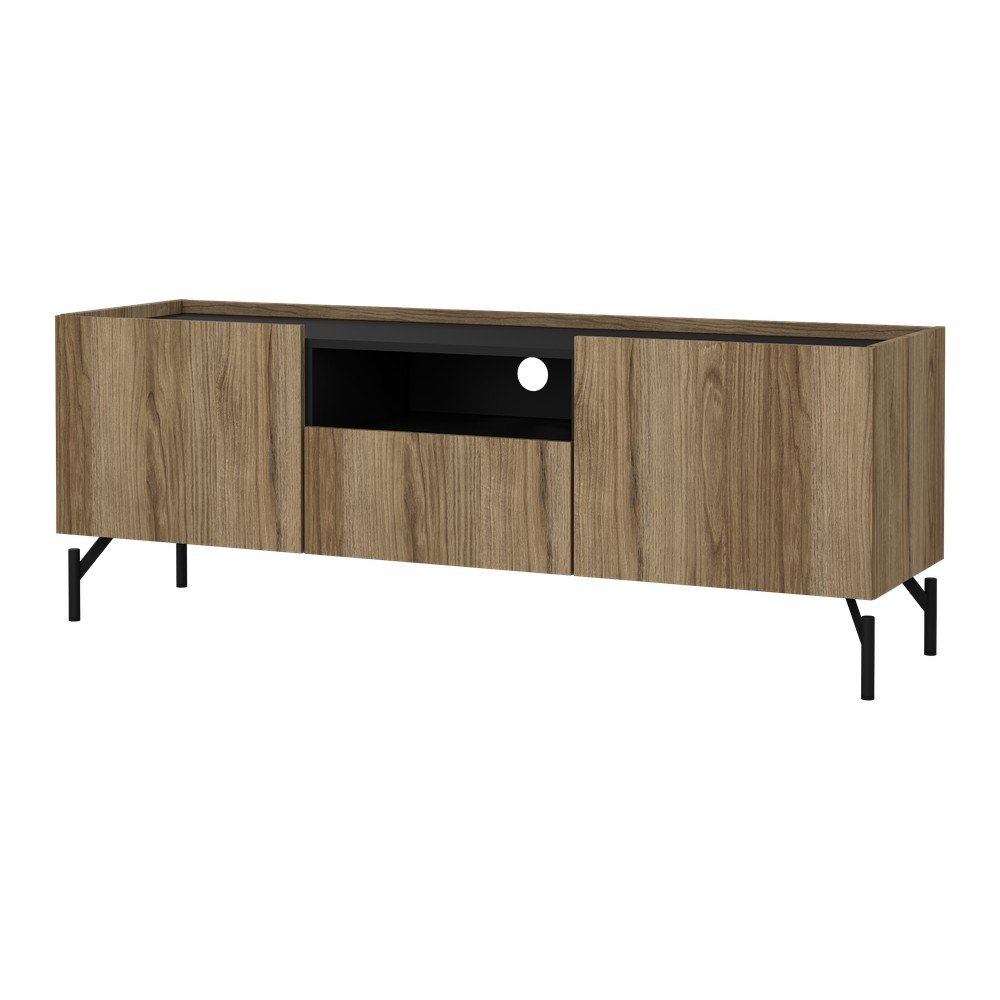 Szafka w dekorze dębu o szerokości 147 cm oferuje mnóstwo miejsca do przechowywania dzięki dwóm szafkom z regulowanymi półkami i jednej szufladzie. Otwarta środkowa część zapewnia łatwy dostęp do sprzętu, a system zarządzania kablami pozwala wszystko uporządkować. Dzięki metalowym nogom i nowoczesnemu wzornictwu pasuje do różnych wnętrz.