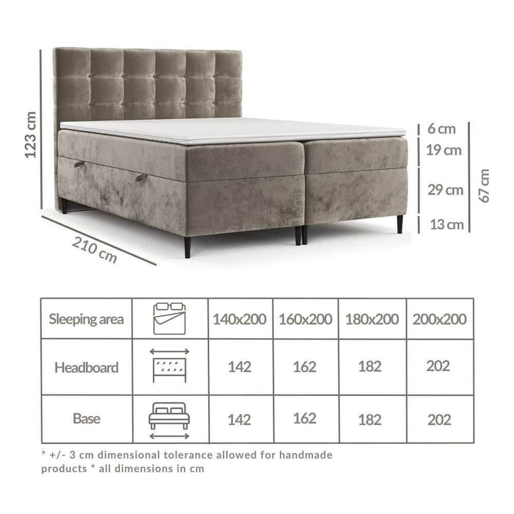 Łóżko typu boxspring łączy w sobie wysokiej jakości materac wykonany ze sprężyn bonellowych i pianki poliuretanowej oraz dwustronny topper wykonany z elastycznej pianki poliuretanowej. Topper nie tylko zwiększa komfort snu, ale także chroni materac przed uszkodzeniami i zabrudzeniami. Jego zdejmowany pokrowiec z ekstraktem z alg można w każdej chwili zdjąć i wyprać w temperaturze do 40⁰C.