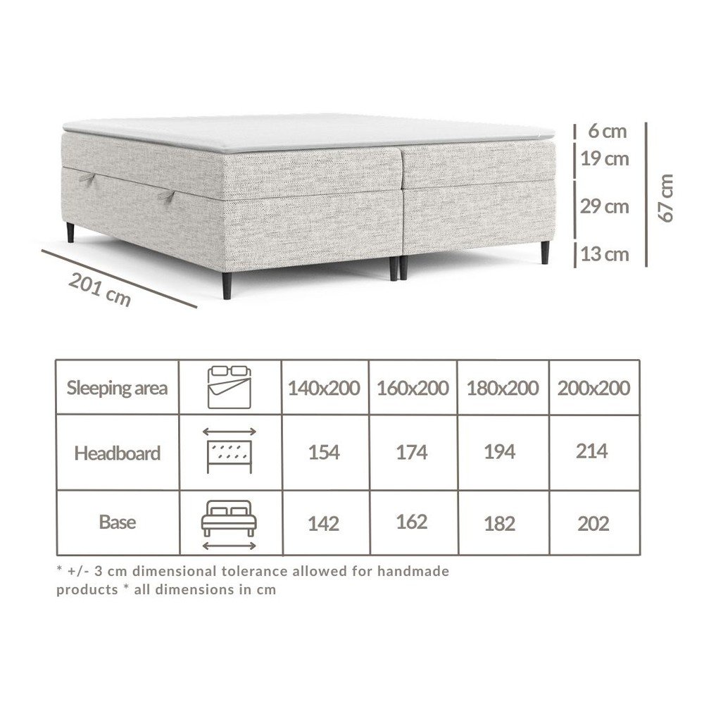 Łóżko typu boxspring łączy w sobie wysokiej jakości materac wykonany ze sprężyn kieszeniowych (262 sprężyny/m2) umieszczonych w pojedynczych kieszeniach oraz dwustronny topper wykonany z elastycznej pianki poliuretanowej. Topper nie tylko zwiększa komfort snu, ale także chroni materac przed uszkodzeniami i zabrudzeniami. Jego zdejmowany pokrowiec z ekstraktem z alg można w każdej chwili zdjąć i wyprać w temperaturze do 40⁰C.