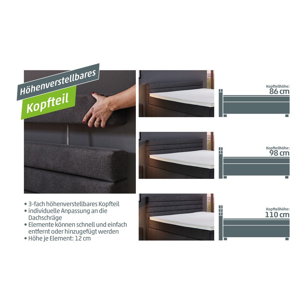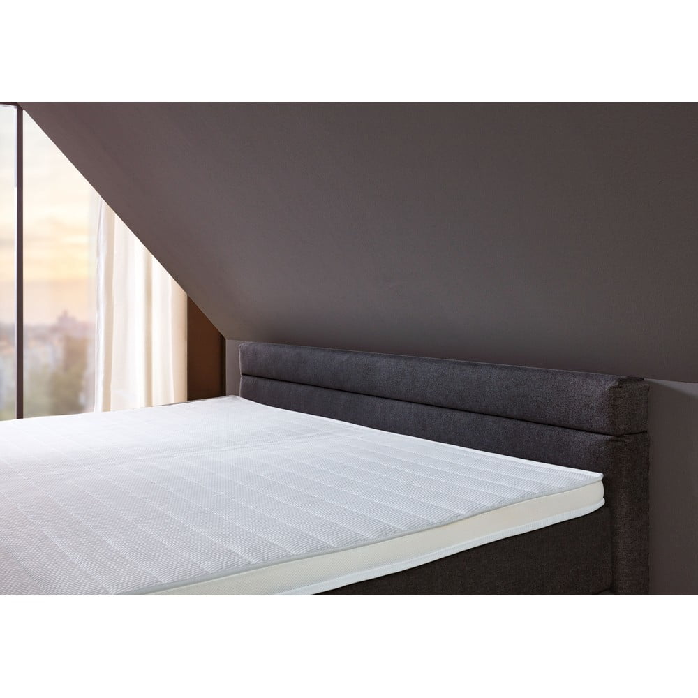Łóżko kontynentalne marki Rojaplast zawiera zarówno materac, jak i topper o wysokości 5 cm. Wypełnienie wykonane jest z pianki PUR o gęstości 25 kg/m3. Kolejną zaletą jest regulowana wysokość wezgłowia w zakresie od 86 do 110 cm.