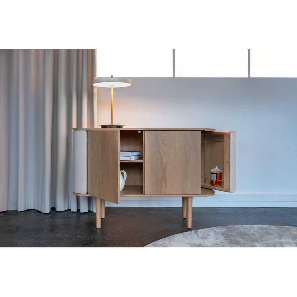 Autorem projektu komody Treasures marki UMAGE jest duński designer Jonas Søndergaard. Konstrukcja wykonana jest z forniru dębowego, a zaokrąglone, otwierane boki pokryte są przyjemną w dotyku tkaniną. Za każdymi z przednich drzwi ukryta jest półka.