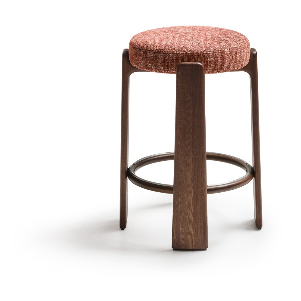 Wygodne, okrągłe siedzisko hokera obito tkaniną szenilową o wyraźnej strukturze. Materiał to poliester z recyklingu, pochodzący od dostawcy z certyfikatem Global Recycled Standard, co gwarantuje mniejsze zużycie zasobów i surowców pierwotnych. Dodatkowo tkanina posiada certyfikat OEKO-TEX® STANDARD 100, świadczący o ekologicznie bezpiecznej i odpowiedzialnej produkcji.