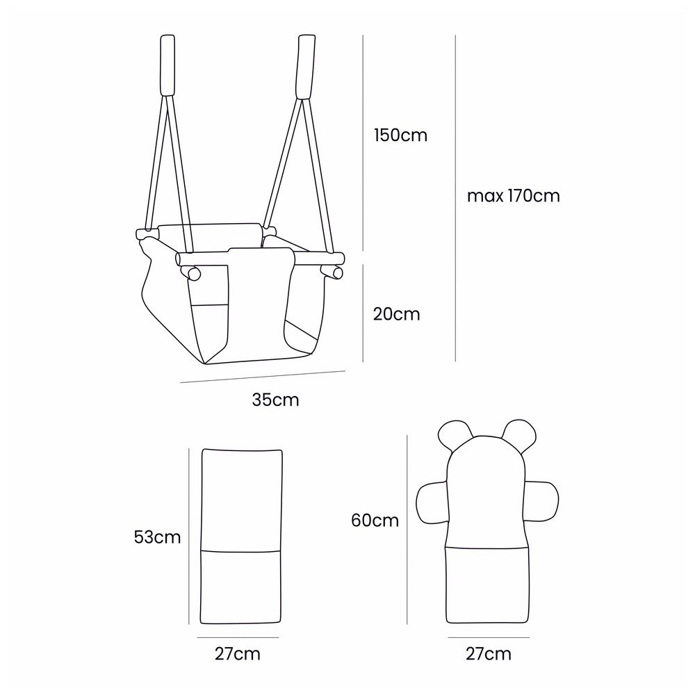 Lekka konstrukcja i jakość wykonania sprawiają, że huśtawka jest łatwa w montażu. Siedzisko jest wzmocnione ukrytą drewnianą płytą, która zapobiega ugięciu i promuje prawidłową postawę. Dla maksymalnego bezpieczeństwa, huśtawka jest wyposażona w pasy bezpieczeństwa i miękkie uchwyty z tkaniny, które pozwalają dziecku bezpiecznie trzymać ją podczas zabawy. Oparcie posiada również urocze małe uszy, które przypominają pluszowego misia.