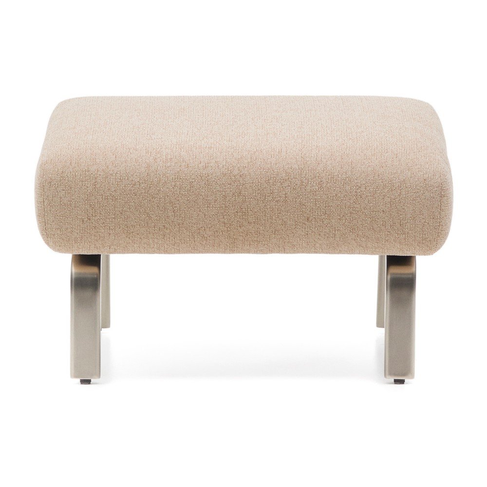 Nogi z szczotkowanej stali nierdzewnej o średnicy 1,8 mm mają elegancko zaokrąglony kształt, zapewniając podnóżkowi nowoczesną i stabilną podstawę. Siedzisko oferuje średnią twardość, idealną do codziennego użytku. Osiągnięto to dzięki połączeniu pasów, sprężyn i warstw pianki o wysokiej gęstości (35 kg/m³ i 40 kg/m³), które gwarantują wytrzymałość, trwałość i doskonały komfort.