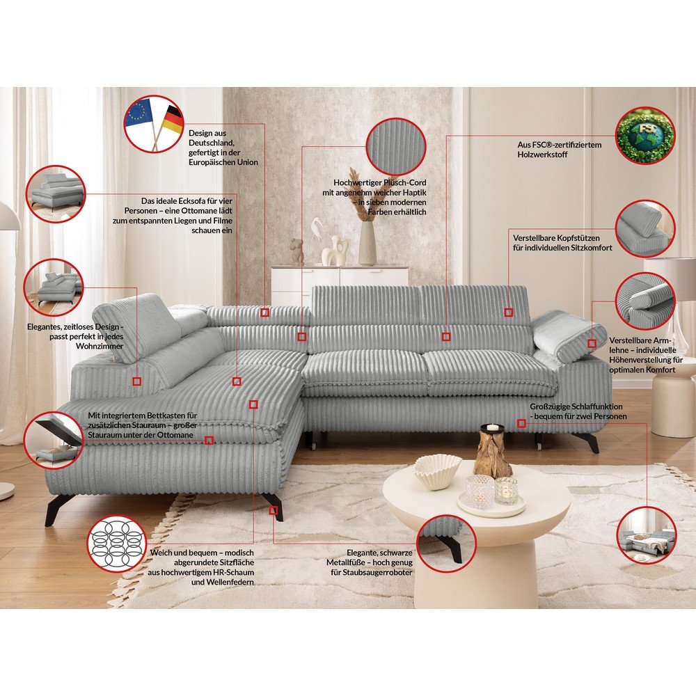 Jasnoszary sztruksowy narożnik (lewostronny/w kształcie litery L) Marbeya – Ropez