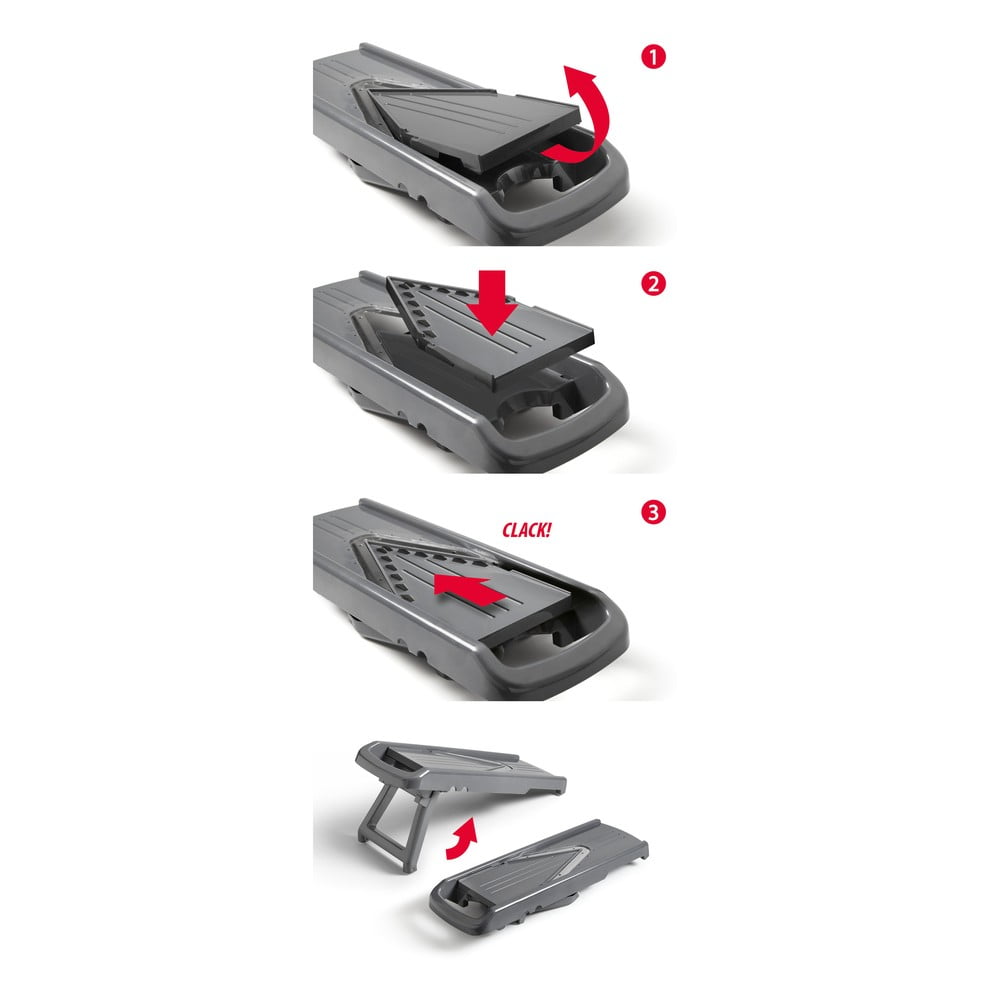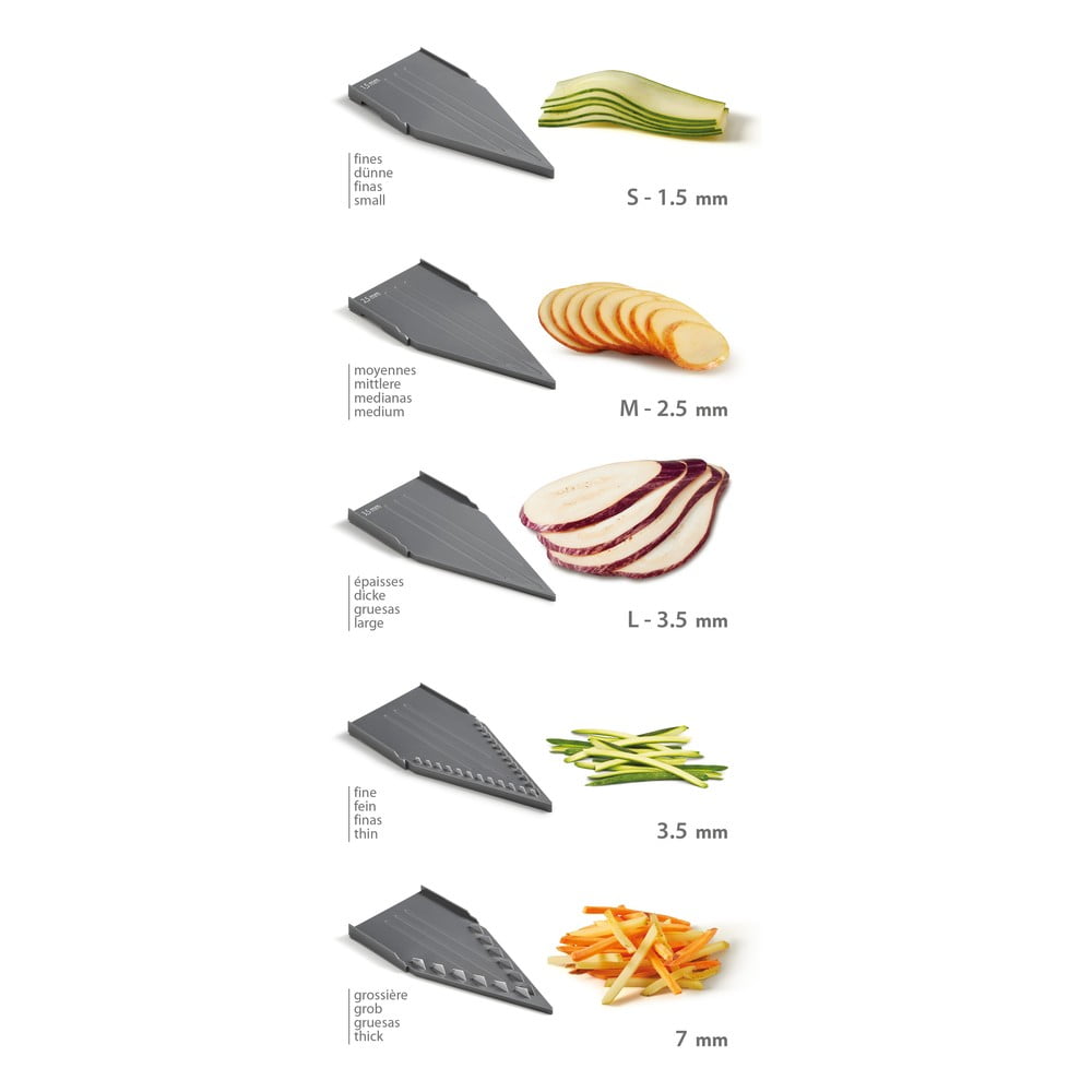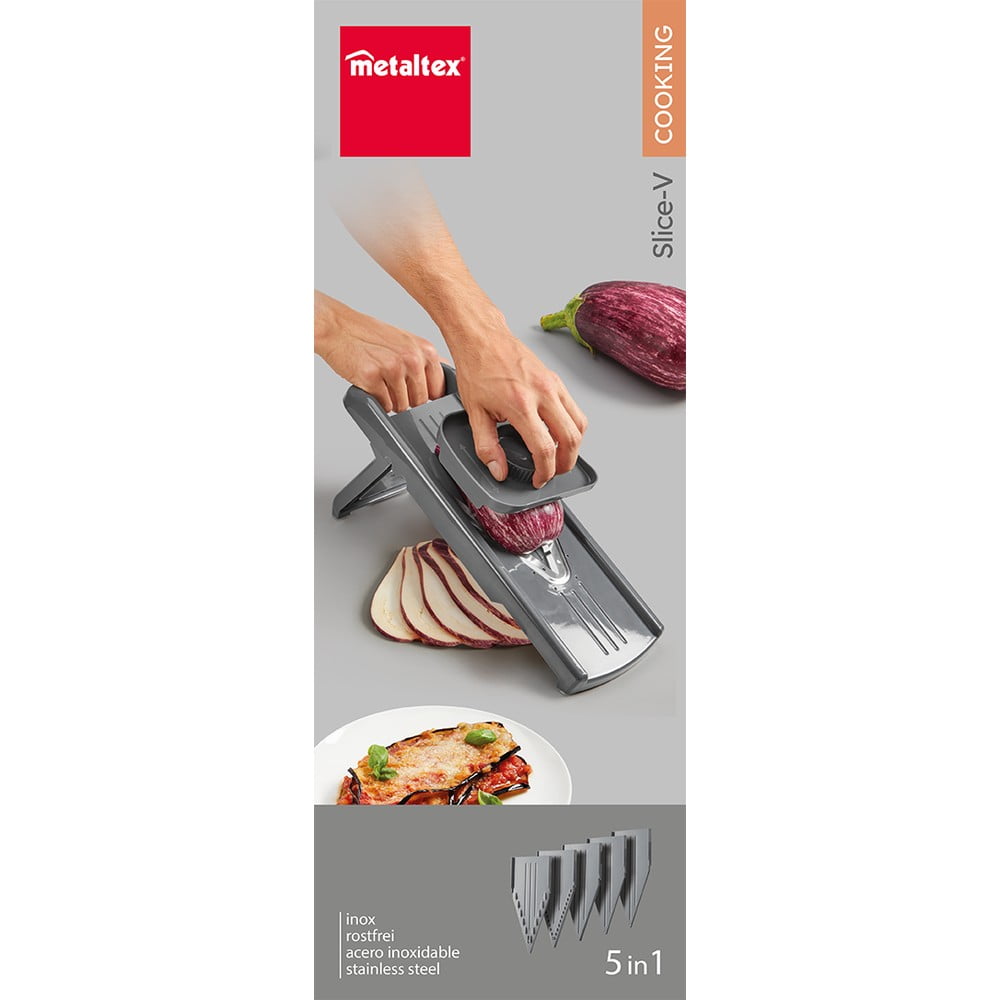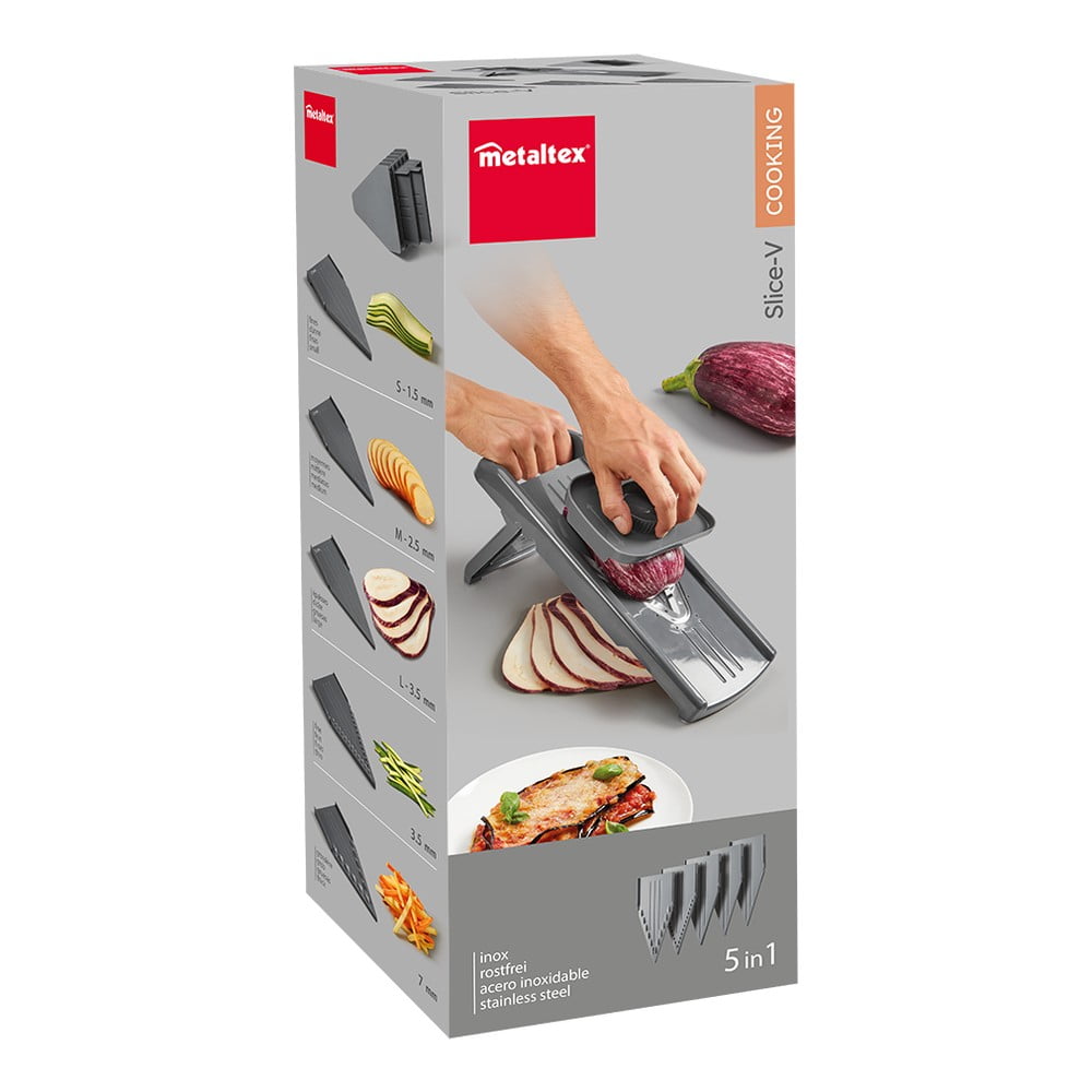 Krajalnica do warzyw Metaltex z pięcioma wymiennymi nasadkami ułatwia krojenie owoców i warzyw w cienkie plasterki, grubsze wiórki lub julienne.
