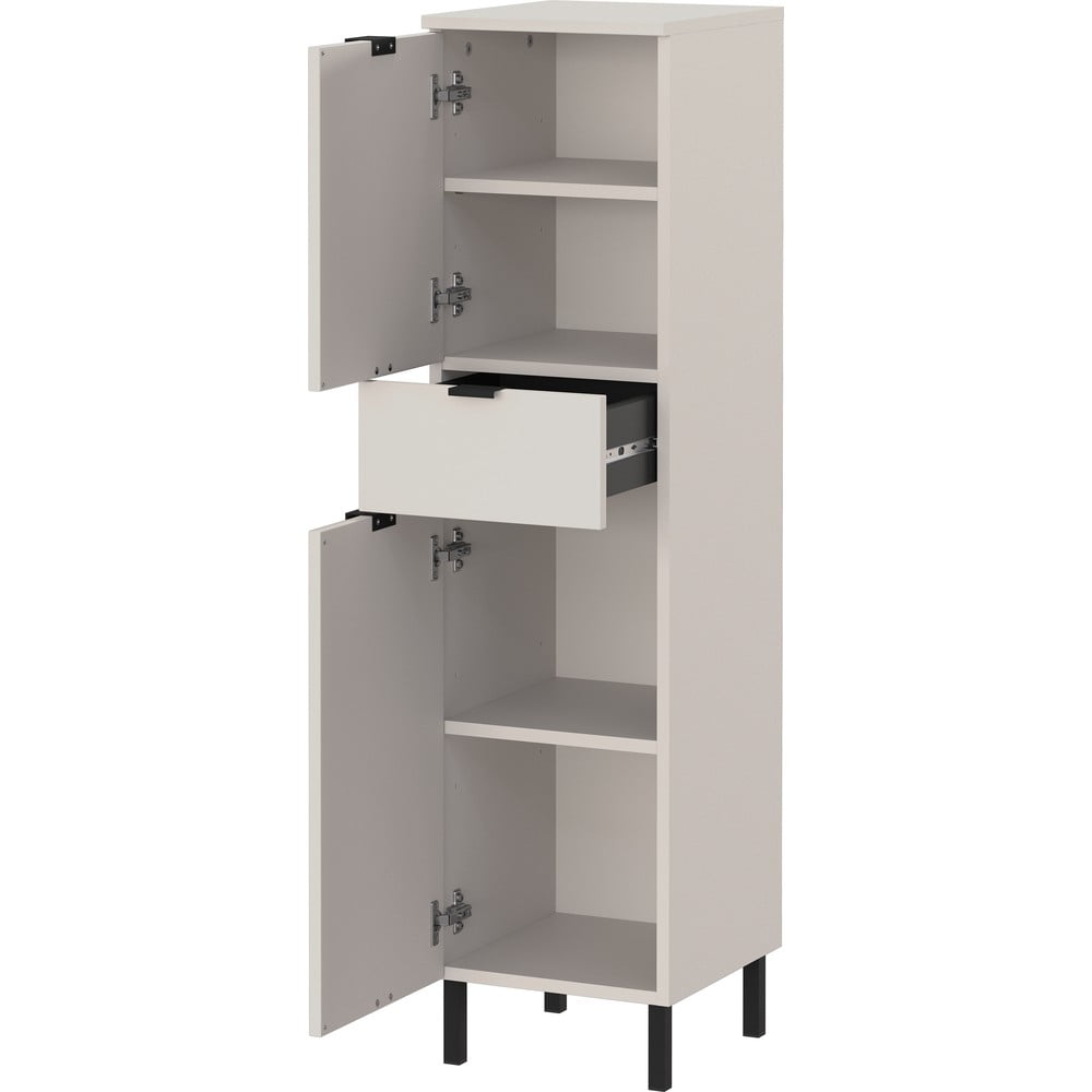 Szafka podumywalkowa z regulowaną półką i dolną półką ma nośność do 10 kg, górna półka do 3 kg. Szafka środkowa ma szufladę o nośności do 10 kg, dwoje drzwi z trzema regulowanymi półkami i otwartą komorę (nośność do 10 kg). Wysoka szafka posiada szufladę (nośność 10 kg), drzwi z trzema regulowanymi półkami (każda o nośności 10 kg) oraz otwartą przegrodę (nośność 10 kg). Lustrzana szafka za dwojgiem lustrzanych drzwi kryje dwie szklane półki (każda o nośności 1 kg). W środku znajduje się gniazdko i włącznik światła. Oświetlenie LED (300 x 50 x 95 mm) zapewnia neutralne białe światło.