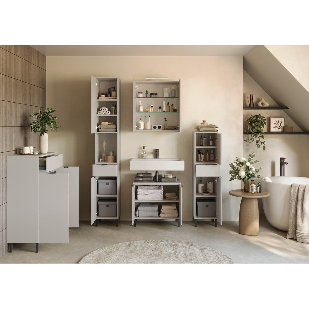 Szafka pod umywalkę posiada górną półkę z wycięciem na syfon (nośność do 3 kg), regulowaną półkę oraz dolną półkę o nośności do 10 kg. Szafka wiszących ma dwoje lustrzanych drzwi, dwie szklane półki (każda o nośności do 1 kg) oraz dolną półkę o nośności do 10 kg. W środku szafki znajduje się gniazdko i włącznik światła.