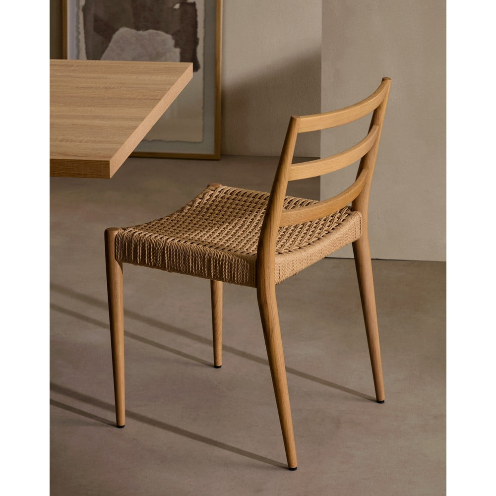 Krzesło wykonane jest w całości z naturalnych materiałów – siedzisko składa się z ręcznie plecionej liny papierowej, konstrukcja wykonana jest z litego drewna z certyfikatem FCS gwarantującym jego zrównoważone pochodzenie.
