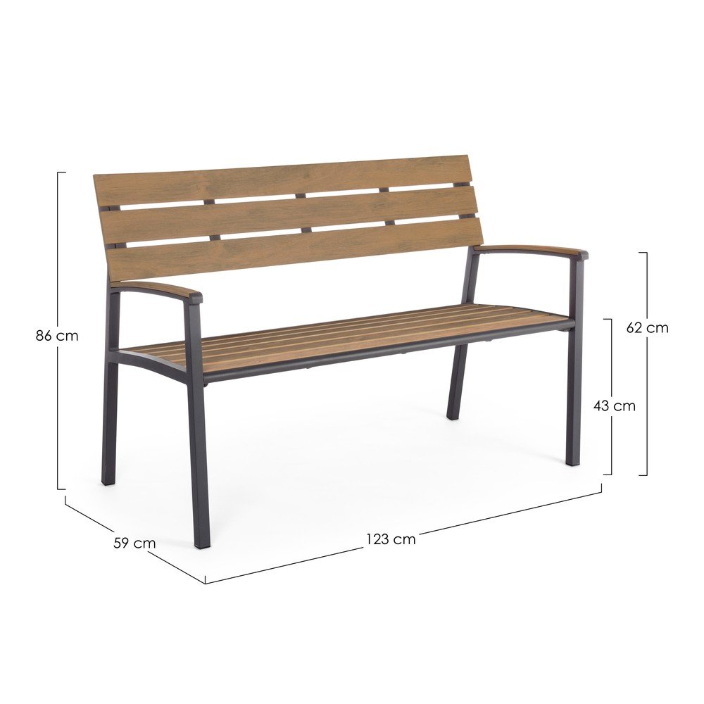 Ławka ogrodowa Isak marki Bizzotto to idealny wybór do relaksu w ogrodzie lub na tarasie. Jej konstrukcja łączy solidną metalową ramę z listwami z materiału polywood, które tworzą siedzisko, oparcie i podłokietniki. Polywood to materiał kompozytowy, który wyglądem przypomina drewno.