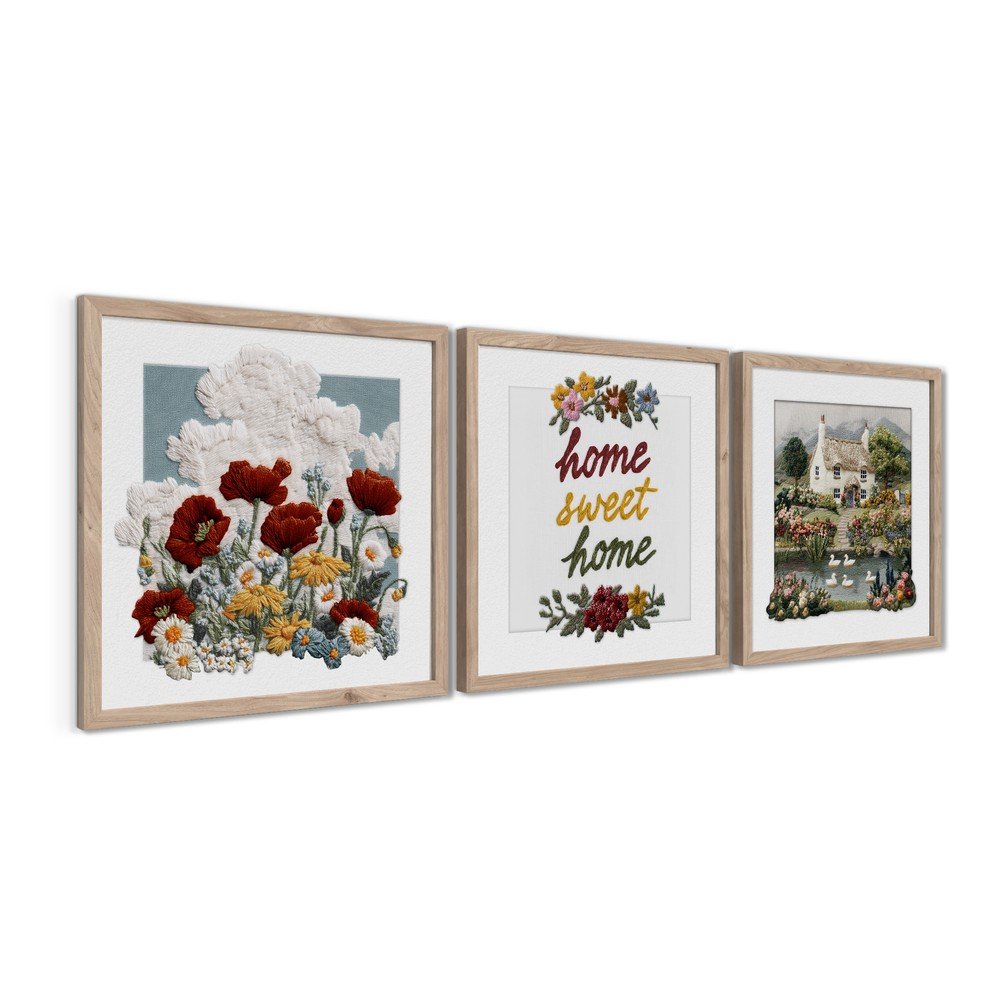 Zestaw obrazów Sweet Home marki Styler doda przytulnego charakteru Twojemu wnętrzu. Te trzy oprawione obrazy charakteryzują się szczegółowym wykonaniem, które wiernie naśladuje iluzję trójwymiarowego haftu i tkanej tekstury na płótnie. Razem tworzą harmonijną całość, która ozdobi każdą ścianę.