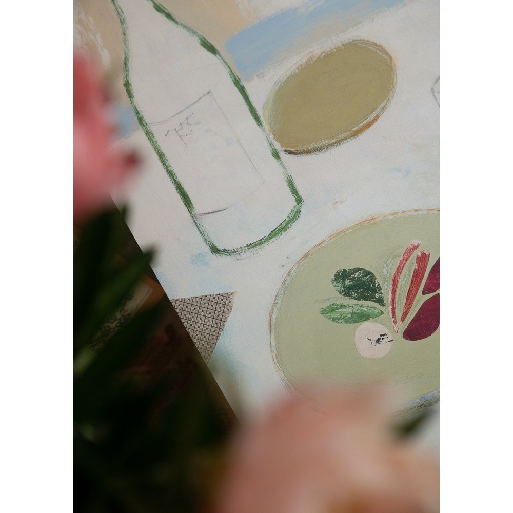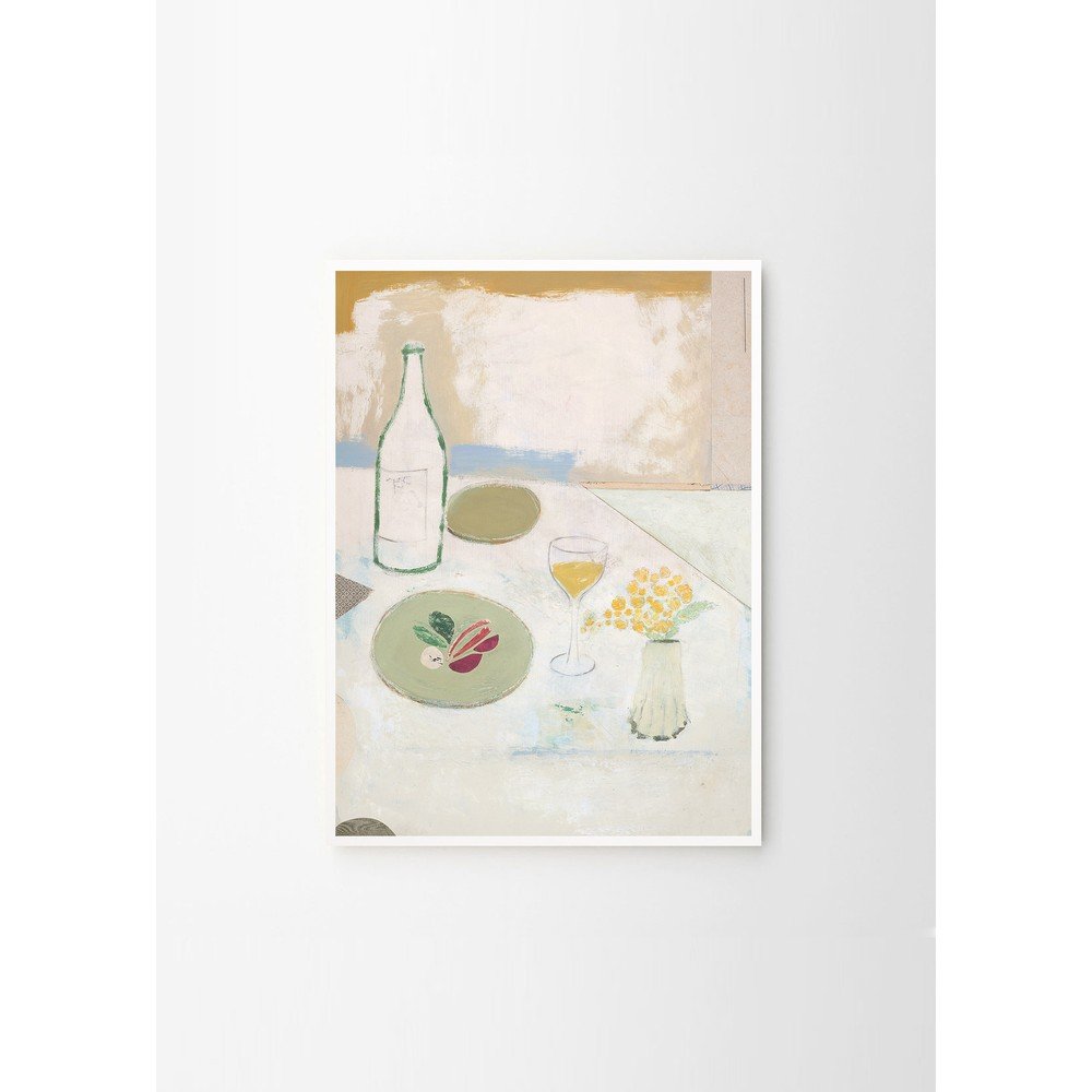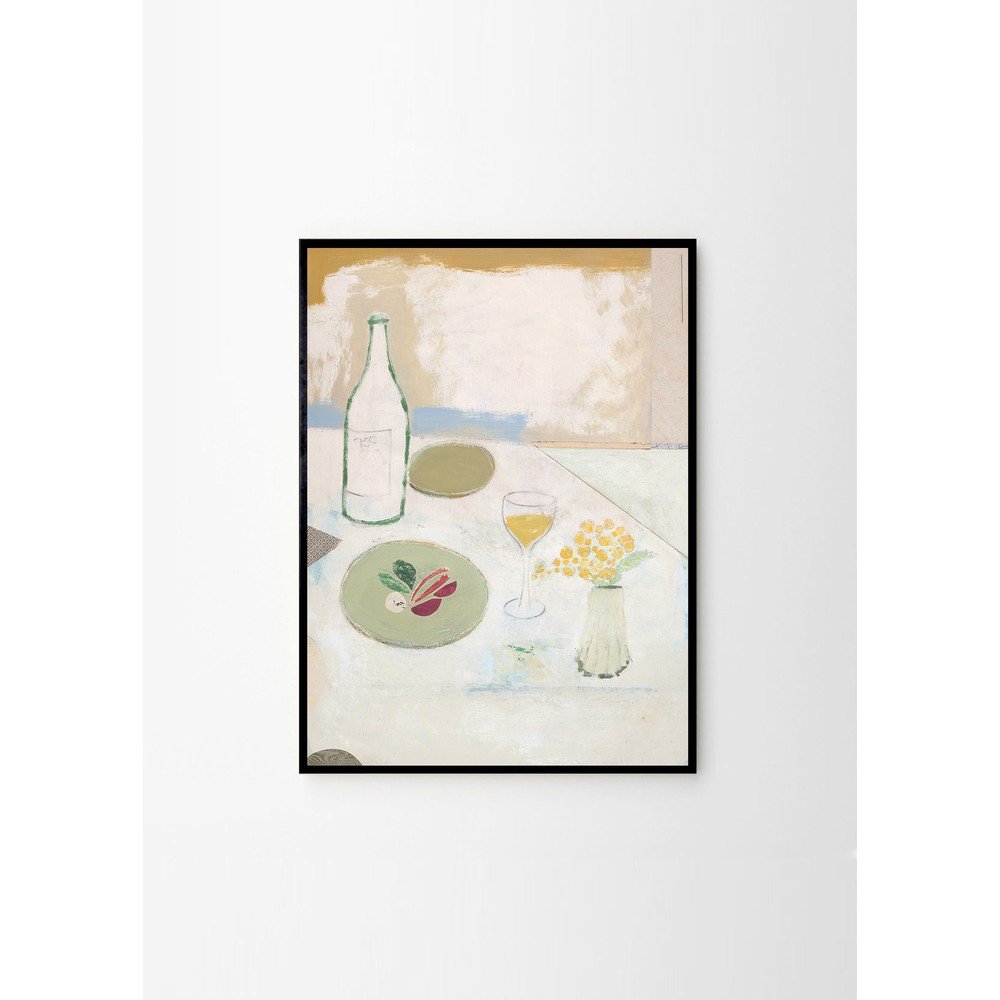 Plakat Fleurs Jaunes – Max Ososki marki Poster Club przedstawia uroczą martwą naturę z butelką, szklanką, talerzami i wazonem pełnym kwiatów.