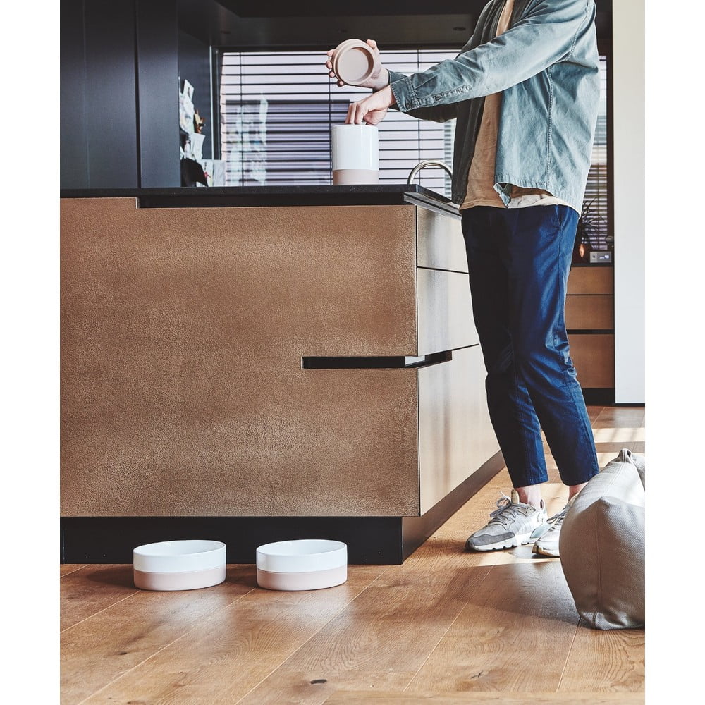 Silikonowa pokrywka szczelnie zamyka miskę, a silikonowa podstawa chroni blat kuchenny przed zarysowaniami, jednocześnie dodając odrobinę koloru do minimalistycznego designu.