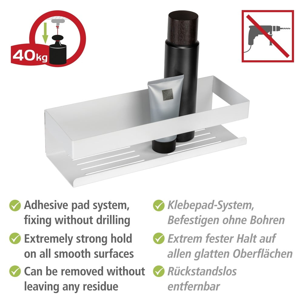 Montaż jest szybki i łatwy, bez konieczności wiercenia. Półka jest mocowana za pomocą specjalnego systemu klejenia Turbo-Loc, który przylega do wszystkich gładkich powierzchni. Wystarczy usunąć folię ochronną z samoprzylepnego podkładu, umieścić uchwyt w żądanej pozycji i docisnąć. Podkład samoprzylepny można usunąć bez pozostawiania śladów. Dzięki specjalnemu systemowi samoprzylepnemu każdy element mocujący może wytrzymać do 40 kg.