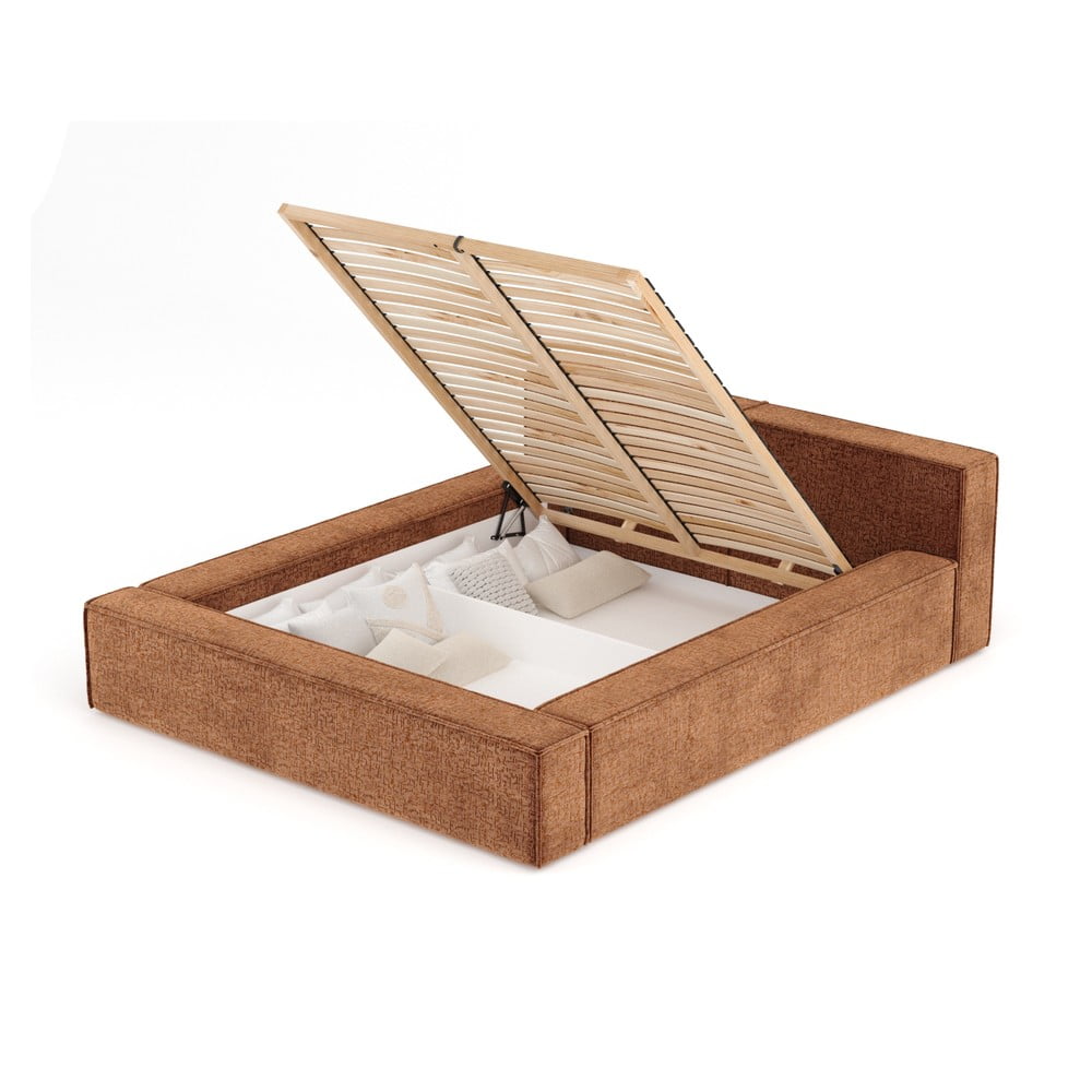 Praktycznym rozwiązaniem jest wbudowany schowek, który otwiera się z przodu i z łatwością pomieści pościel, koce i inne tekstylia. Schowek ma wymiary 140 x 100 x 18 cm (szer. x gł. x wys.).