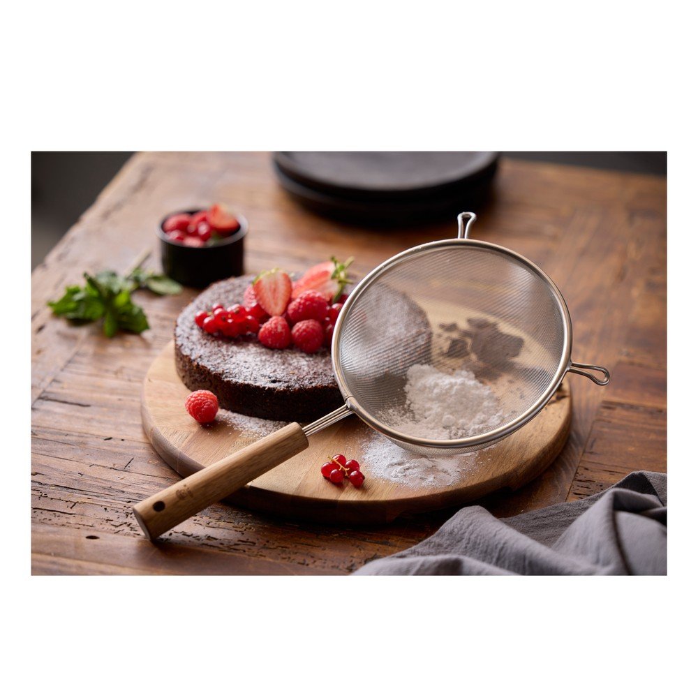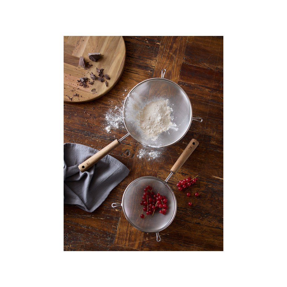 Sitko ze stali nierdzewnej posiada uchwyt wykonany z drewna akacjowego z certyfikatem FSC™. Mając to na uwadze, przed pierwszym użyciem należy dokładnie umyć produkt gorącą wodą i płynem, a co najmniej kilka razy w roku pokryć uchwyt olejem kuchennym.