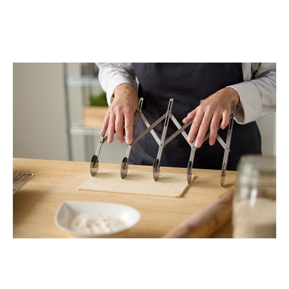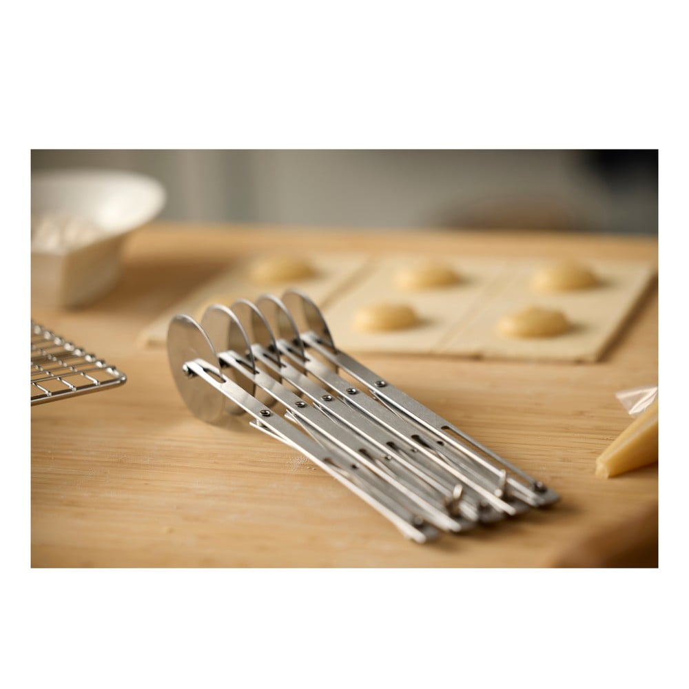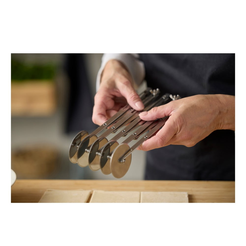 Znacznik do ciasta Blomsterbergs został zaprojektowany do precyzyjnego krojenia przy minimalnym wysiłku. Składa się z pięciu kół ze stali nierdzewnej (o średnicy 5,7 cm) z bardzo ostrymi ostrzami, których rozstaw można regulować w zakresie od 1 do 11,5 cm. Ułatwia to przygotowanie różnych rodzajów domowego makaronu, a także innych słonych lub słodkich przysmaków, które wymagają precyzyjnie pokrojonego ciasta.