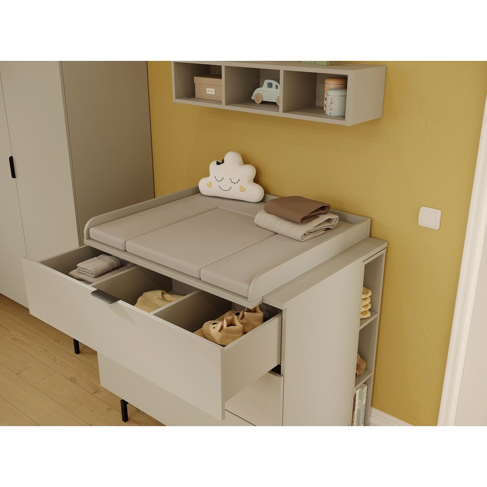 Komoda dziecięca Tomino to stylowy i praktyczny mebel, którego nie powinno zabraknąć w żadnym dziecięcym pokoju. Trzy szuflady są wyposażone w funkcję cichego domyku, która zapewnia płynne i bezpieczne zamykanie. Górna szuflada wysuwa się w całości i ma sprytne przegrodami ułatwiające przechowywanie. Komodę można również uzupełnić o pasujący przewijak.
