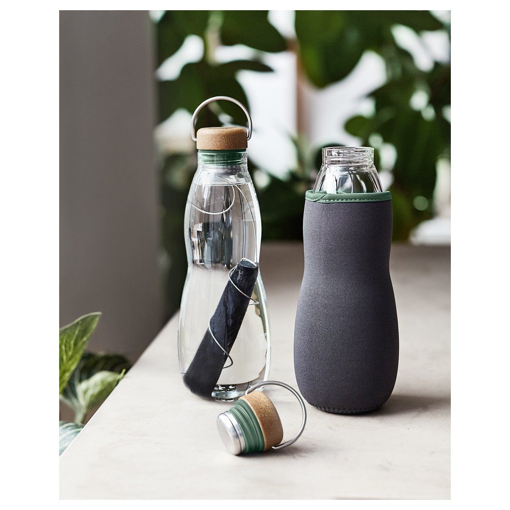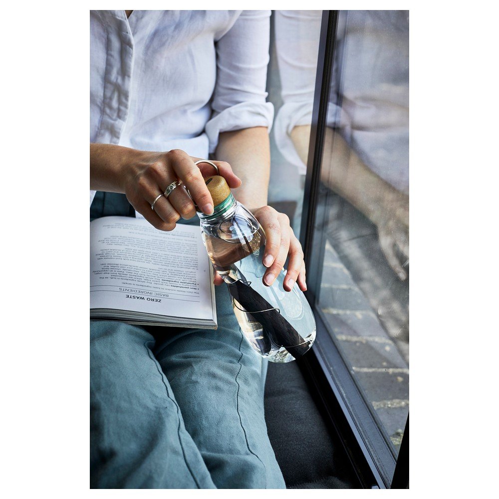 Praktyczna zakrętka wykonana jest z połączenia włókien drzewnych, stali nierdzewnej i polipropylenu, uzupełniona silikonową uszczelką bez BPA. Dla ochrony i izolacji szklanej butelki dołączono również pokrowiec z poliestru z recyklingu.
