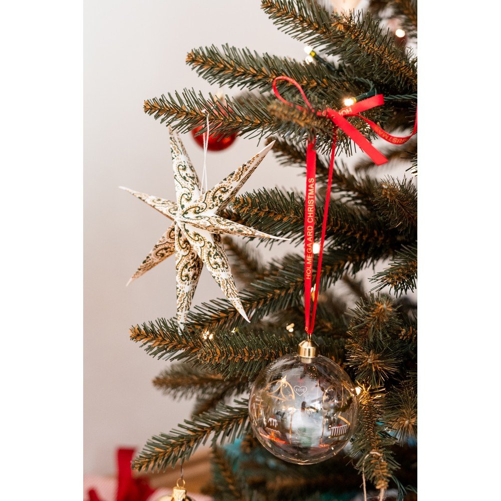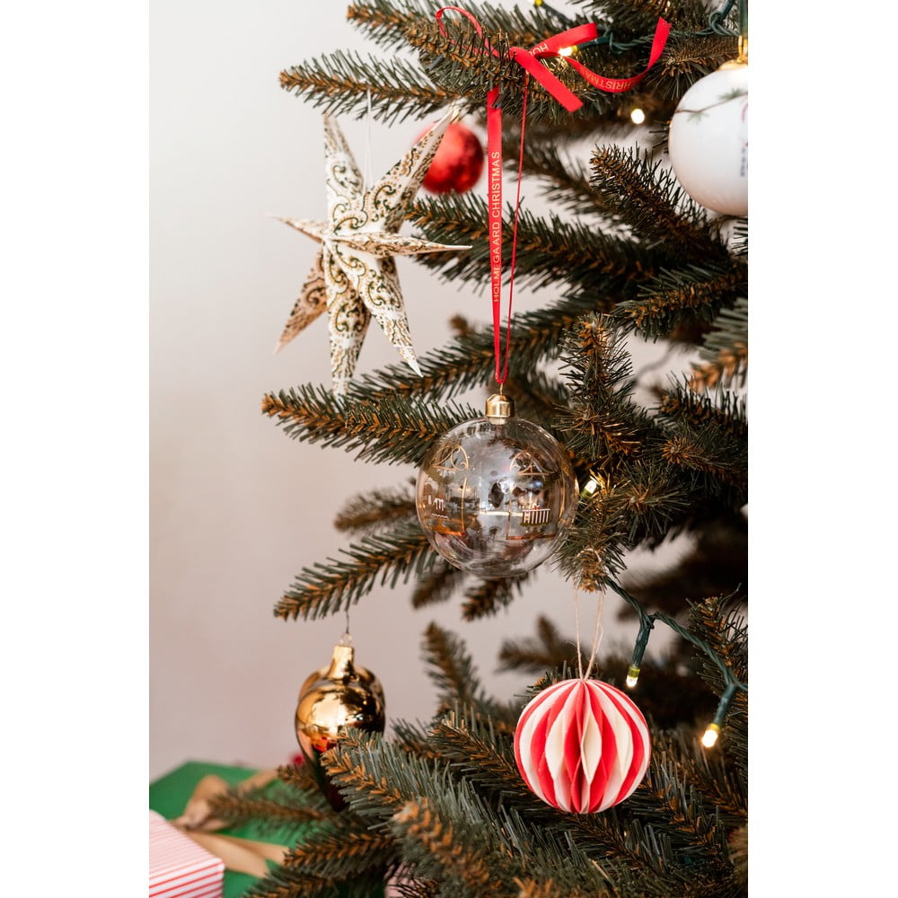 Bombka wykonana jest z ręcznie dmuchanego szkła i uzupełniona czerwoną jedwabną wstążką.