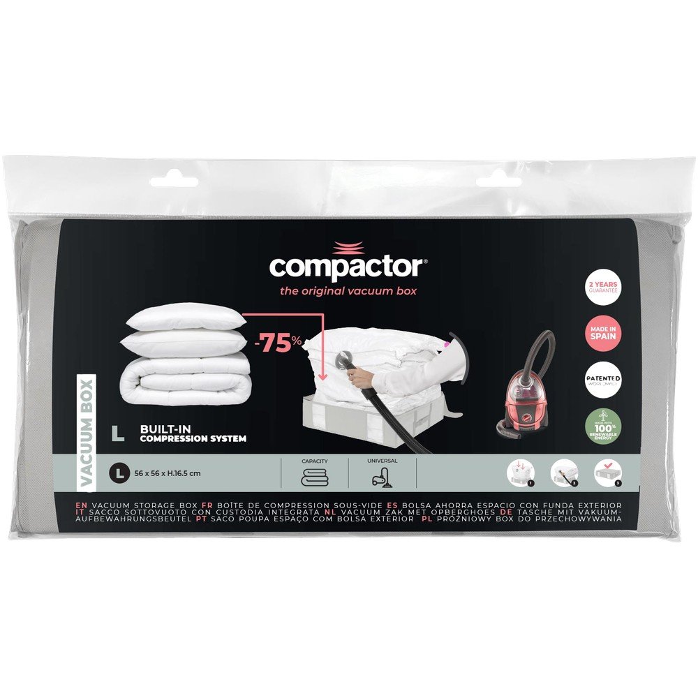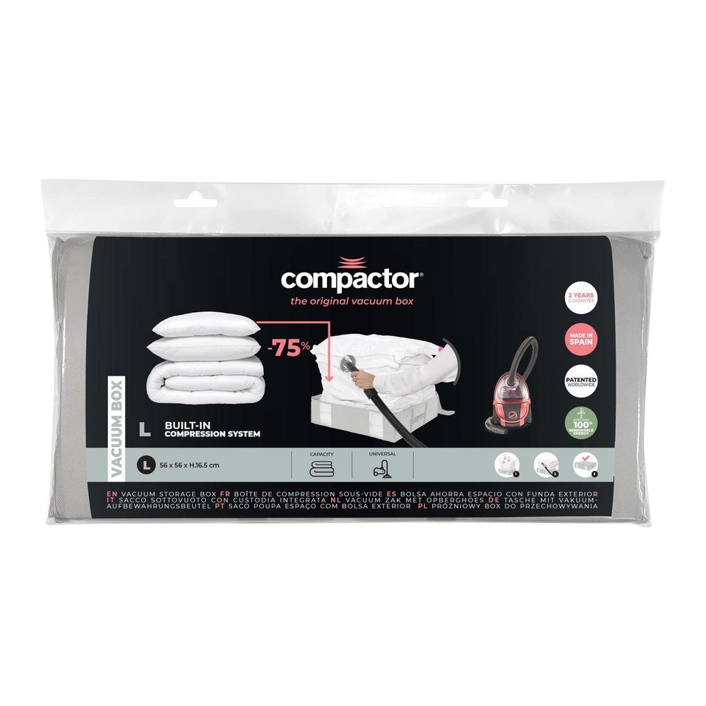 Nadmiar powietrza można wygodnie odessać za pomocą domowego odkurzacza. Dzięki zaworowi jednokierunkowemu nie trzeba się martwić o ponowne napompowanie worka po odessaniu powietrza. Posiada również przezroczyste okienka ułatwiające identyfikację zawartości i zintegrowane paski ściągające do przechowywania także w pozycji pionowej.