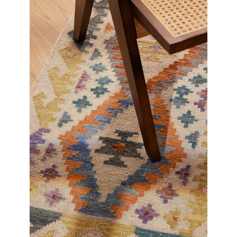 Dywan Kamal Oasis marki Nouristan wniesie do Twojego salonu kolory i wzory zaczerpnięte afgańskiej kultury. Ręcznie tkany dywan z geometrycznym wzorem w jasnych kolorach jest dwustronny i wykonany w 80% z wełny i 20% z bawełny.