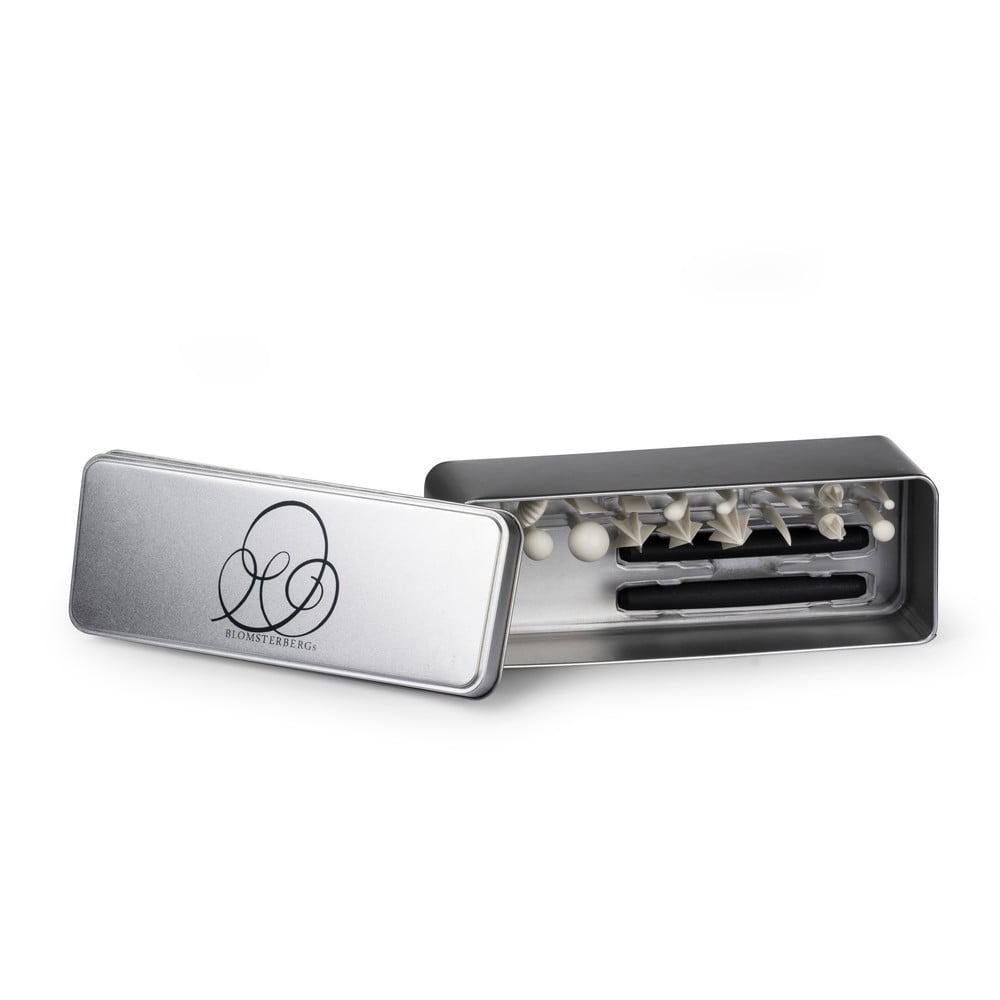 Dzięki osiemnastu różnym tykom zestaw cukierniczy marki Blomsterbergs umożliwia łatwe, precyzyjne i szczegółowe modelowanie dekoracji z marcepanu lub masy cukrowej. Wraz z dwoma podwójnymi uchwytami można je przechowywać w dołączonym metalowym pojemniku.