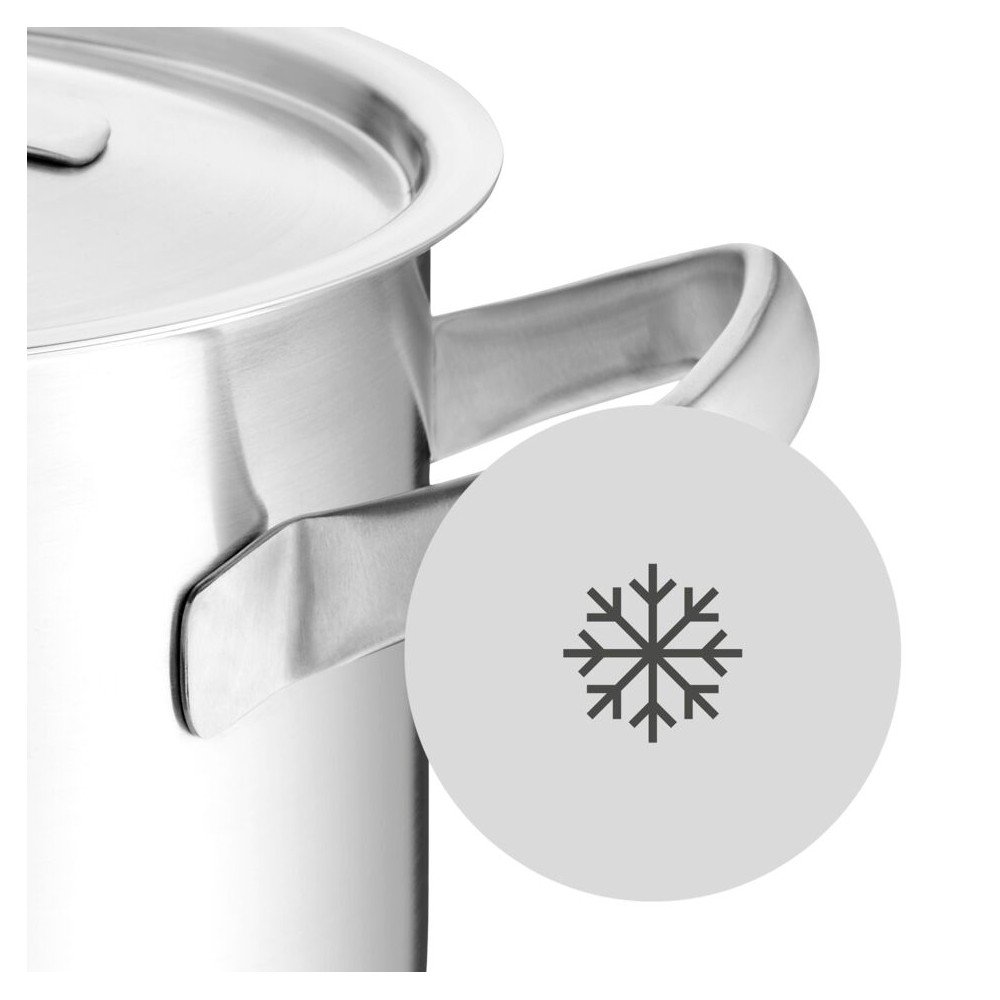 Naczynia wykonano z wysokiej jakości stali nierdzewnej, która jest trwała i łatwa w utrzymaniu czystości. Garnki mają średnice 16, 20 i 24 cm oraz pojemności odpowiednio 1,9, 3,9 i 5,7 litra. Cały komplet nadaje się do użytku w piekarniku w temperaturze do 250°C.