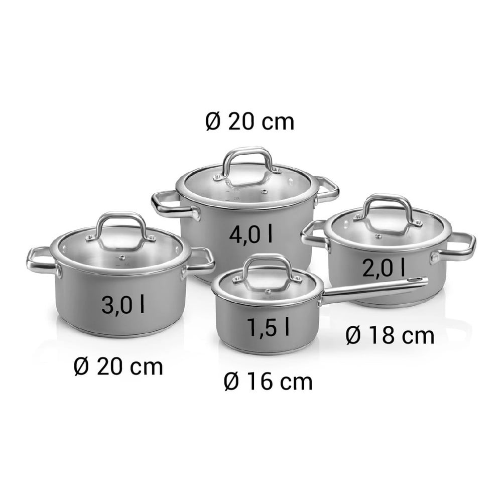 Ośmioczęściowy zestaw naczyń ze stali nierdzewnej Delight to kompletne rozwiązanie dla Twojej kuchni. Dzięki specjalnej powłoce na zewnątrz, konserwacja jest łatwa i nie wymaga użycia specjalnych środków do czyszczenia stali nierdzewnej. Zestaw nadaje się do wszystkich rodzajów kuchenek, w tym indukcyjnych. Każdy element ma solidną pokrywę ze stali nierdzewnej z otworami parowymi, wygodne uchwyty i podstawę indukcyjną typu sandwich. Zestaw zawiera: