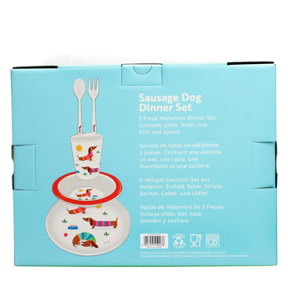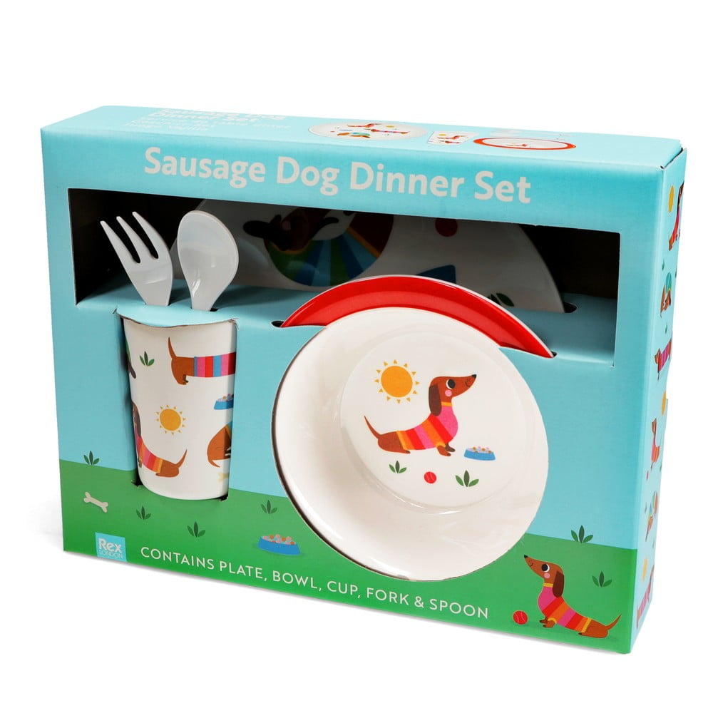 Zestaw naczyń dla dzieci Sunny Sausage Dog marki Rex London składa się z pięciu elementów. Cały zestaw ozdobiony jest wizerunkami jamników w pasiastych sweterkach.