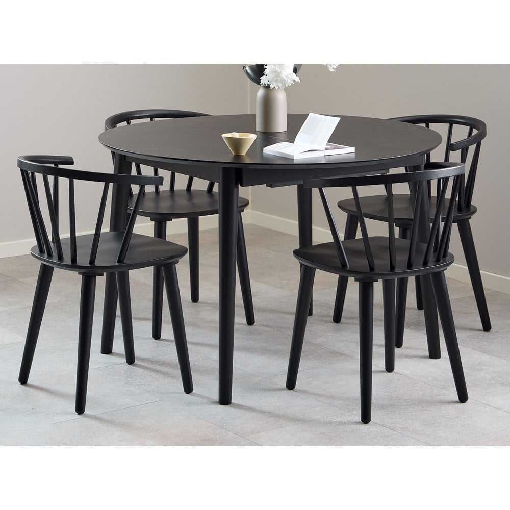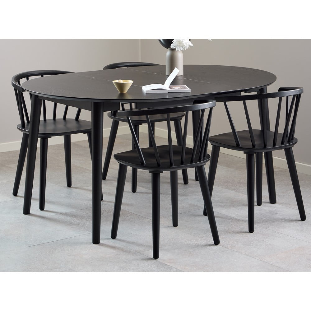 Krzesła Ida mają zakrzywione oparcie wykonane z lakierowanego na czarno drewna kauczukowego.
