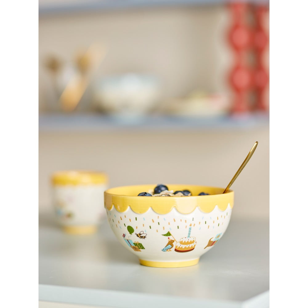 Miska Celebrate marki Bloomingville Mini jest wykonana z kamionki. Jest ozdobiona wesołymi ilustracjami w delikatnych odcieniach, które przedstawiają zwierzęta z motywami urodzinowymi, takimi jak tort ze świeczką, prezenty i konfetti.